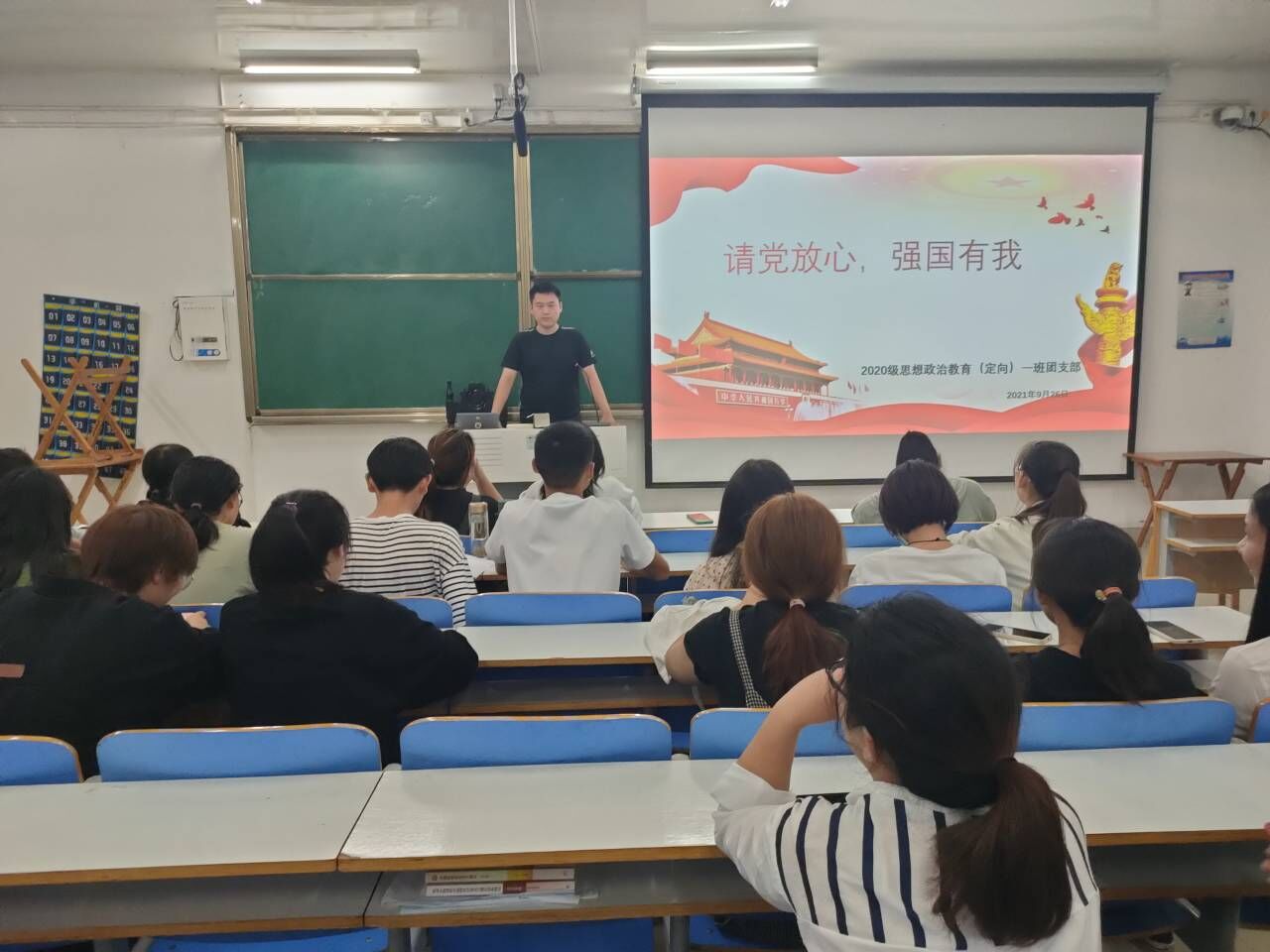9月26日,太阳集团tyc59972020级思想政治教育(定向)一班在社科楼514教室顺利举办“请党放心 强国有我”主题班会。思想政治教育(定向)一班全体学生聆听了此次会议。