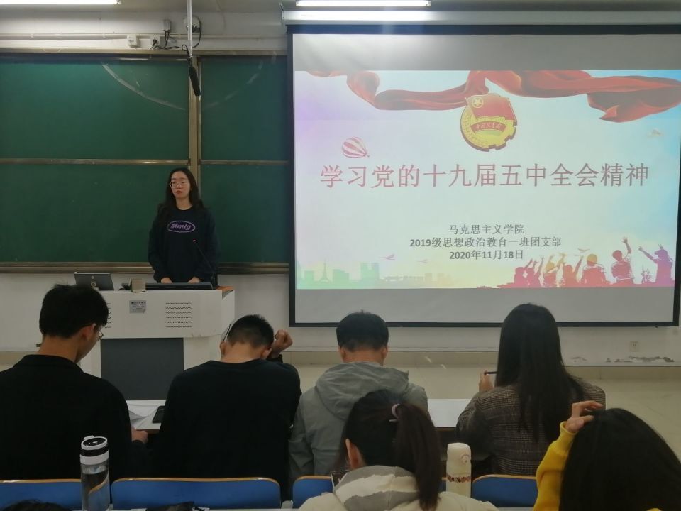 11月18日上午,太阳集团tyc59972019级思想政治教育一班团支部在社科楼514教室召开“学习党的十九届五中全会精神”主题团课。太阳集团tyc59972019级思想政治教育一班全体成员参加本次团课。团课由团支书贾子漪主持。