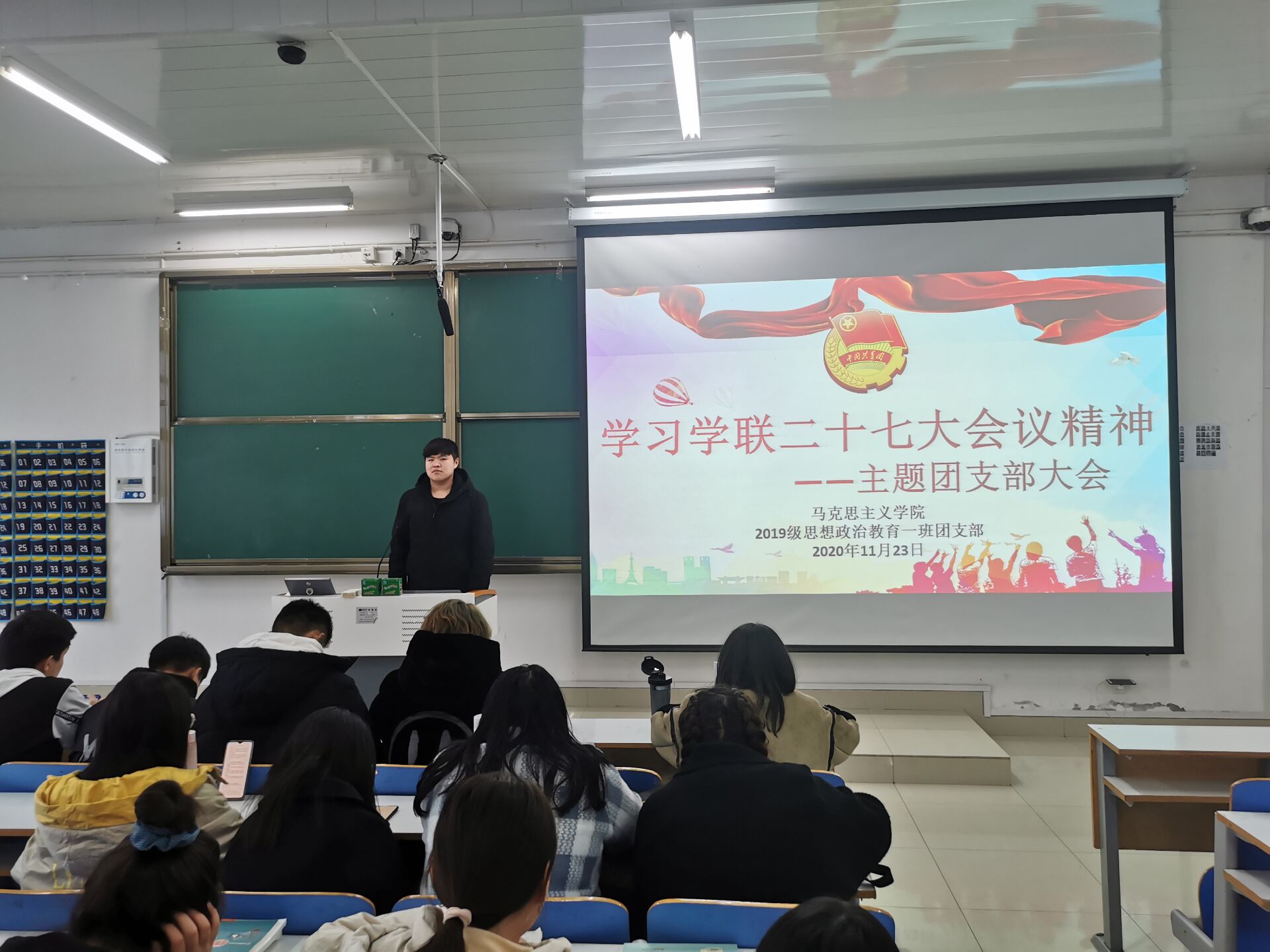11月23日下午,太阳集团tyc59972019级思想政治教育一班第一团支部在社科楼515教室召开“学习学联二十七大会议精神”主题团支部大会。太阳集团tyc59972019级思想政治教育一班全体成员参加本次会议,会议由团支书贾子漪主持。