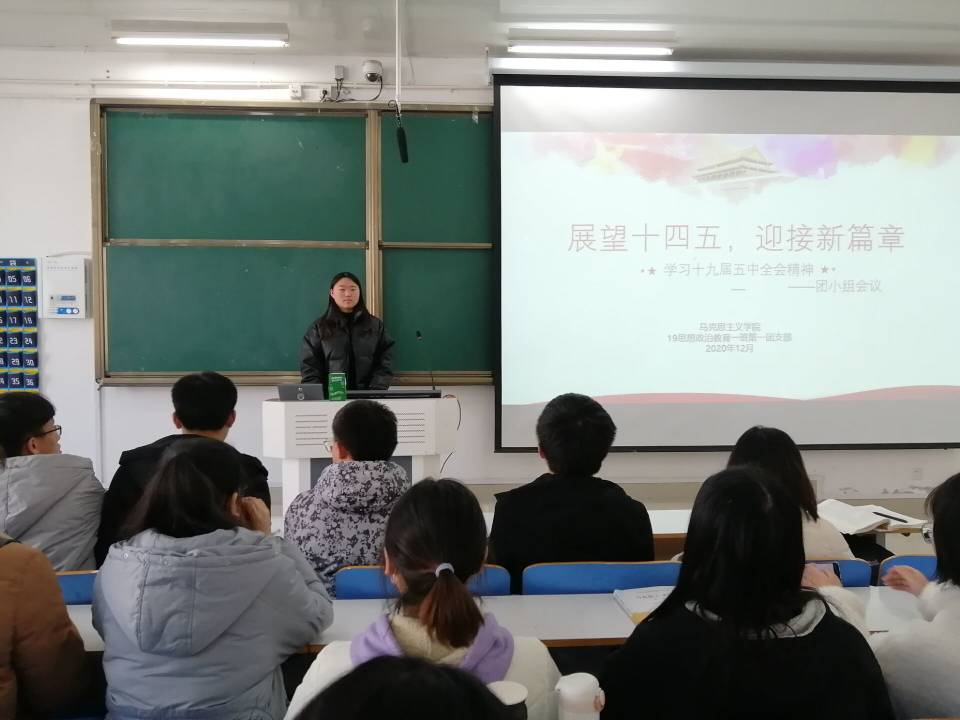 会议伊始,程子硕给团员们展开介绍了十九届五中全会的精神内涵、十四五规划以及2035年远景目标。接着,为了使团员们更加理解十九届五中全会精神,她以图片的形式向团员们展现了十九届五中全会精神的重要作用及团员们在“十四五时期”所面临的历史重任。最后,程子硕对本次会议进行总结。会议在团员们掌声中落下帷幕。