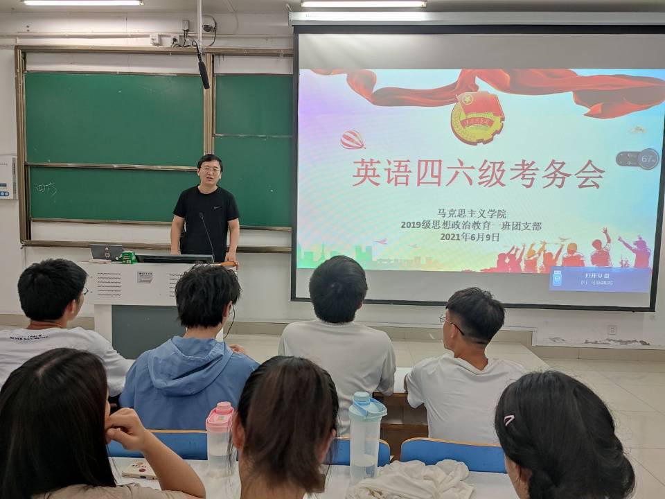 6月9日下午,太阳集团tyc59972019级思想政治教育一班在社科楼515教室召开英语四六级考务会。2019级思想政治教育一班全体成员参加本次考务会。考务会由辅导员曹栋主持。