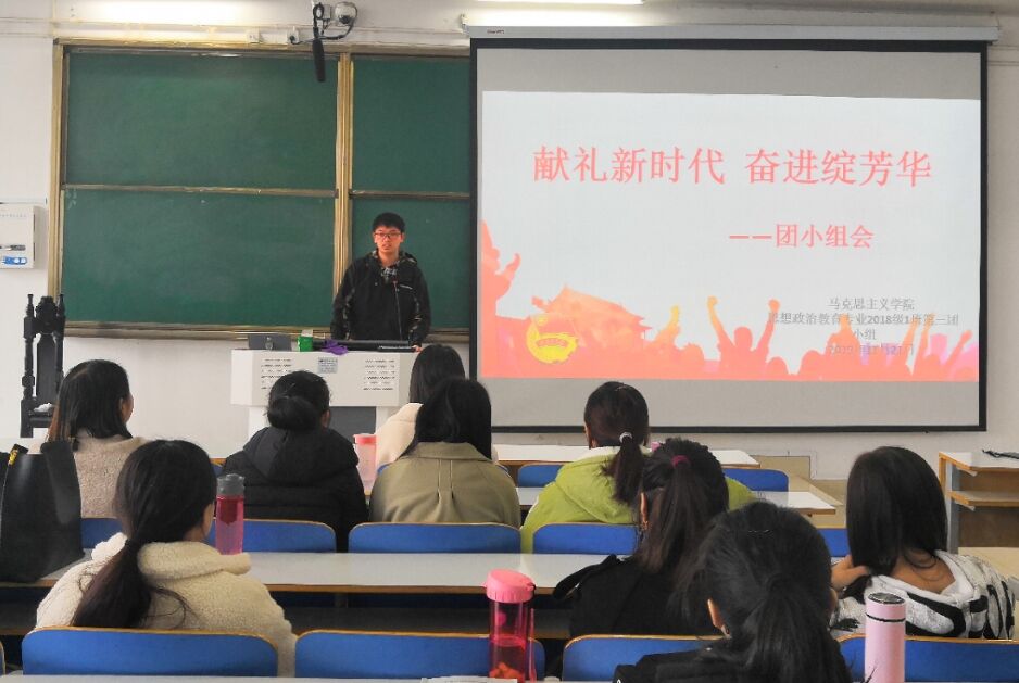 11月21日上午,太阳集团tyc59972018级思想政治教育一班第三团小组在社科楼514教室顺利开展“献礼新时代,奋进绽芳华”主题团会。第三团小组全体成员共同参加此次团会。此次团会由团小组组长丁一主持。