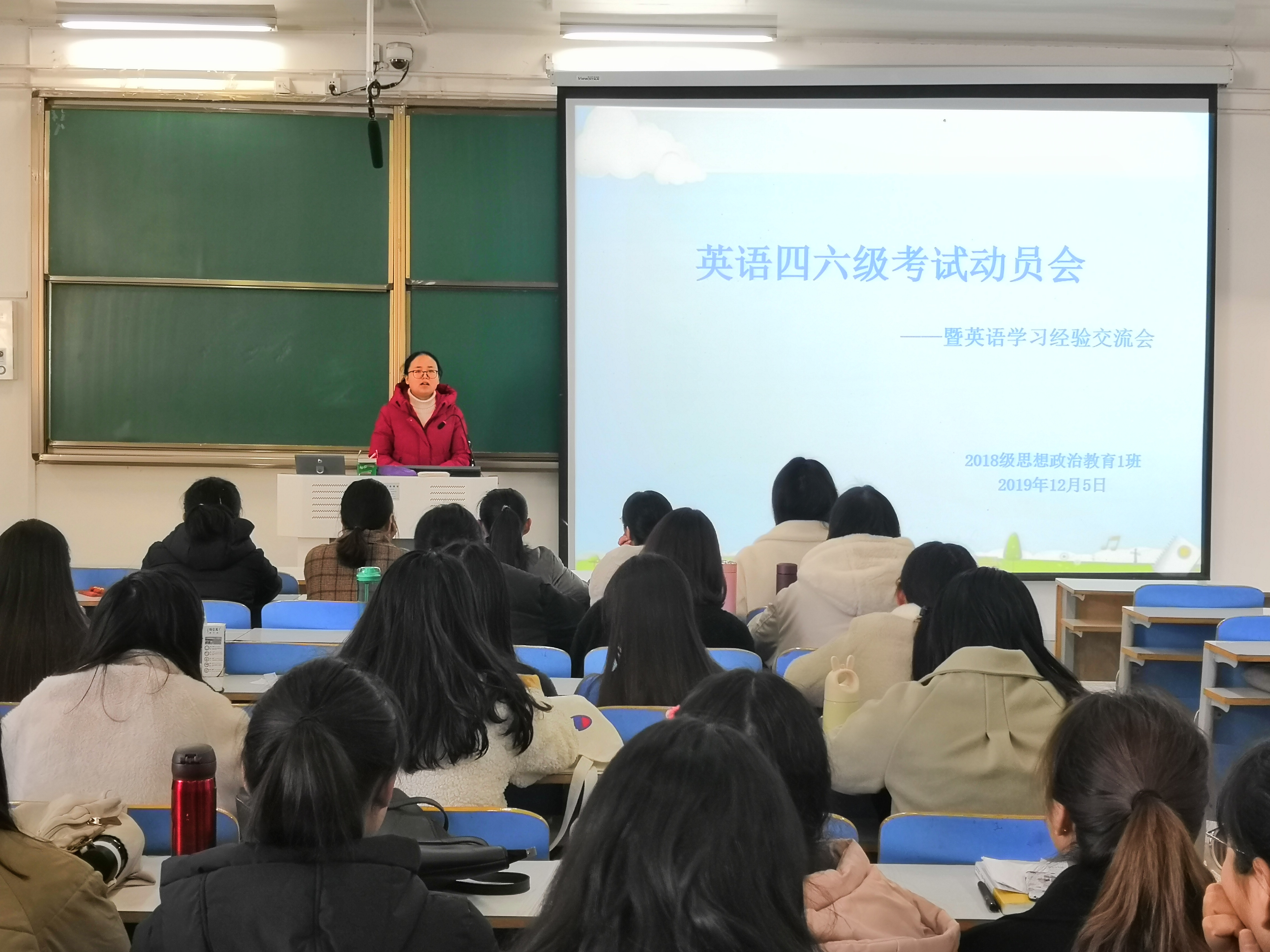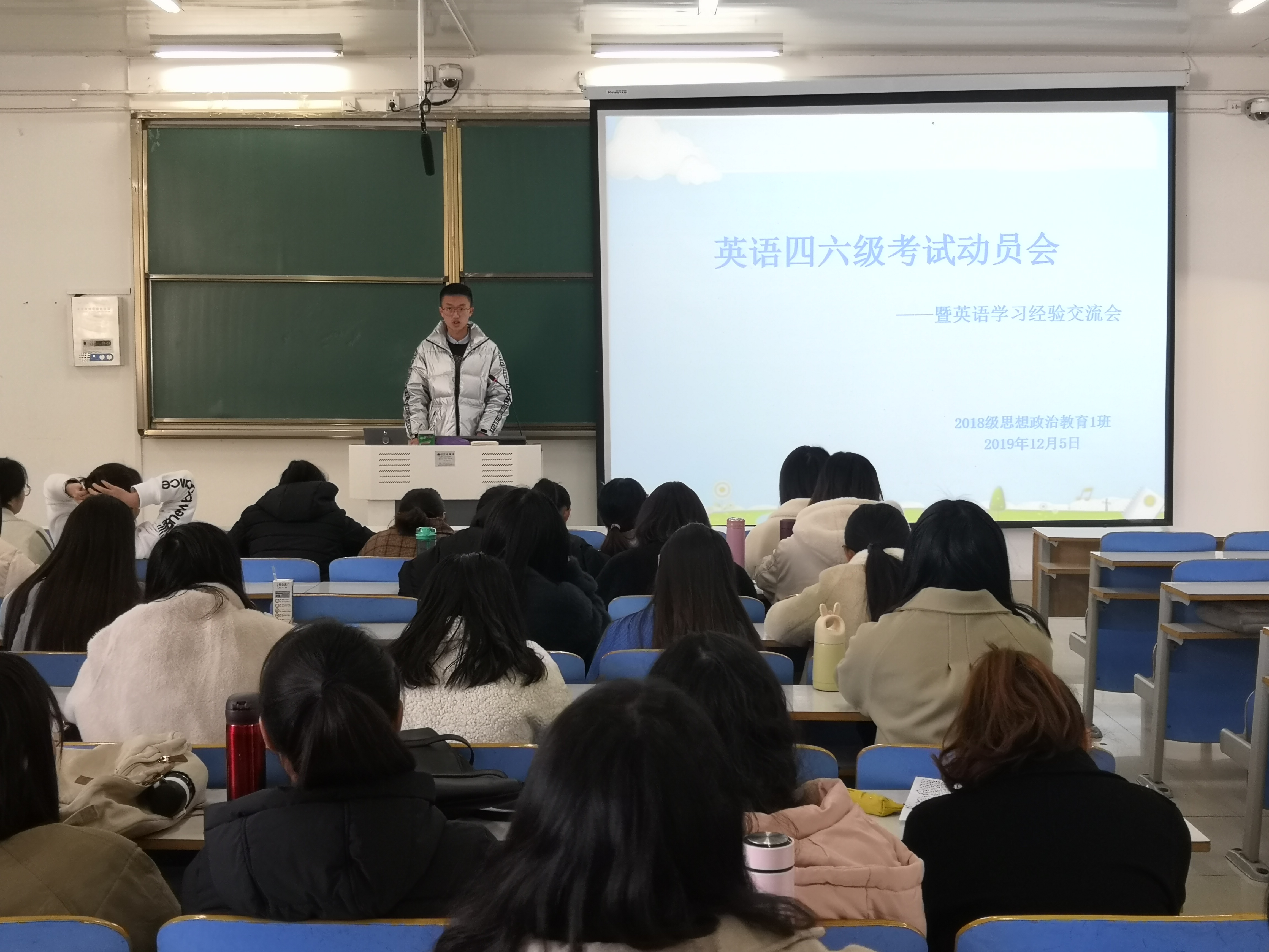 12月5日上午,太阳集团tyc59972018级思想政治教育一班在社科楼514教室顺利开展英语四六级考试动员会。2018级思政一班全体同学共同参加此次会议。此次会议由班长邢子豪主持。