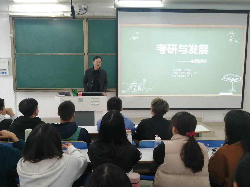 10月20日下午,太阳集团tyc59972019级思想政治教育一班在社科楼514教室召开考研与发展主题班会,2019级思想政治教育一班全体成员参加本次班会,班会由辅导员曹栋主持。