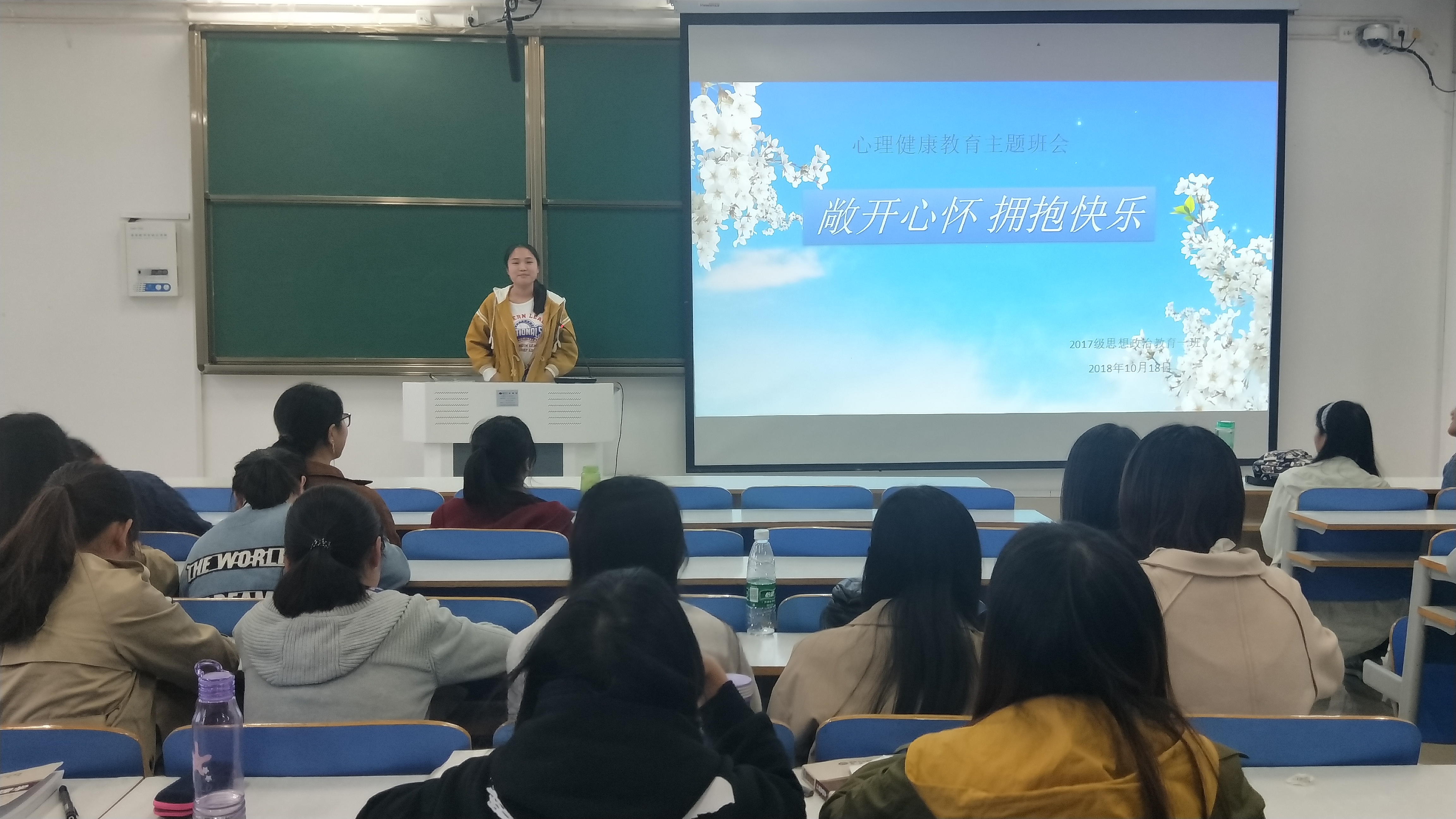 为提高我班学生心理调节能力,保持积极向上的心态,10月22日下午,太阳集团tyc59972017级思想政治教育一班全体学生在社科楼514教室举办了“敞开心扉,拥抱快乐”主题班会,本次班会由团支书谢文静主持。