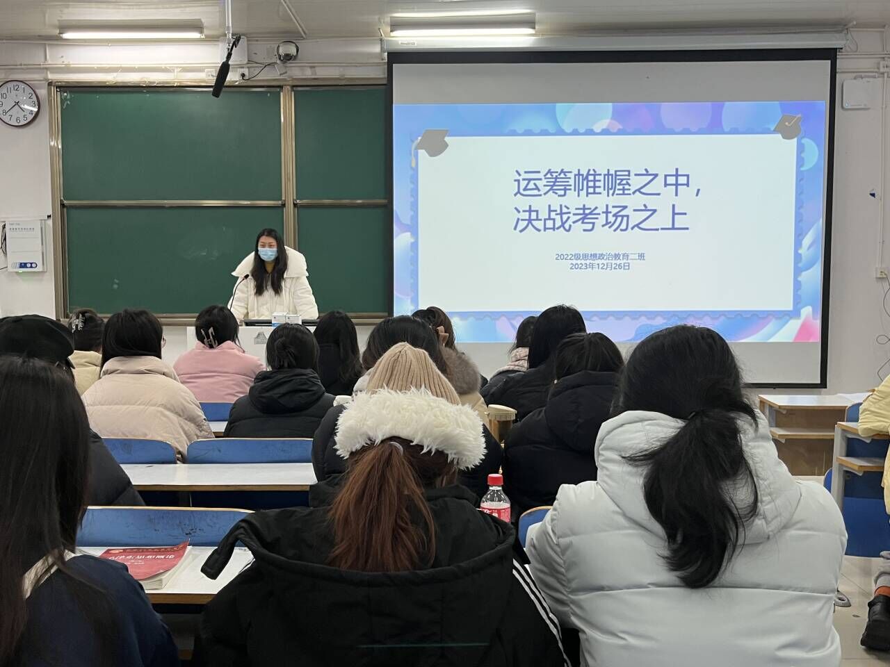 12月26日下午,太阳集团tyc59972022级思想政治教育二班在社科楼514教室开展“运筹帷幄之中,决战考场之上”期末动员班会。我院2022级思想政治教育二班全体成员共同参与此次班会。会议由班主任杨春艳主持。