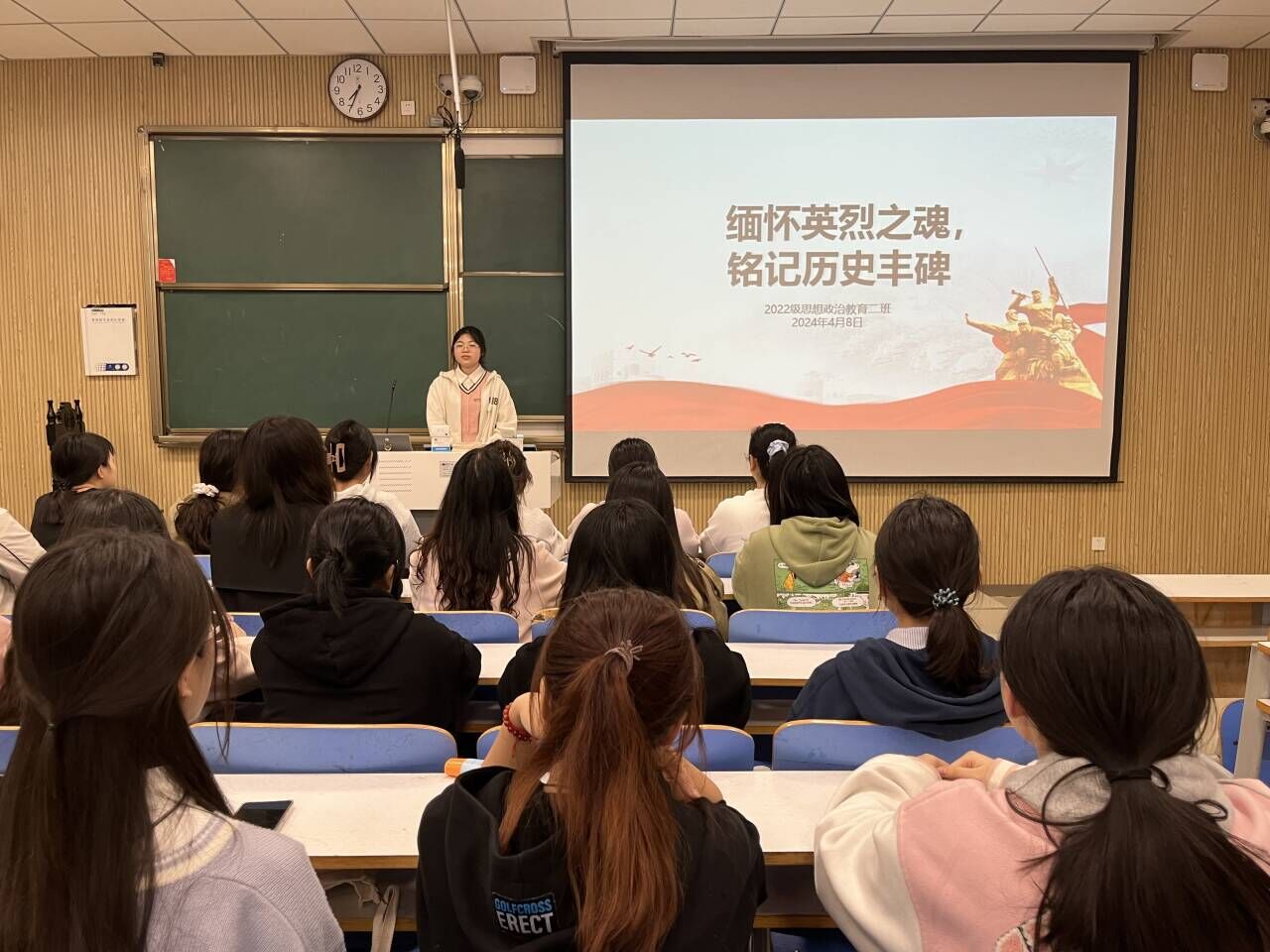 4月8日晚上,太阳集团tyc59972022级思想政治教育二班在社科楼515教室召开“缅怀英烈之魂,铭记历史丰碑”主题团课。我院2022级思想政治教育二班团支部全体成员共同参与此次团课。团课由团支部副书记冯伟珈主持。