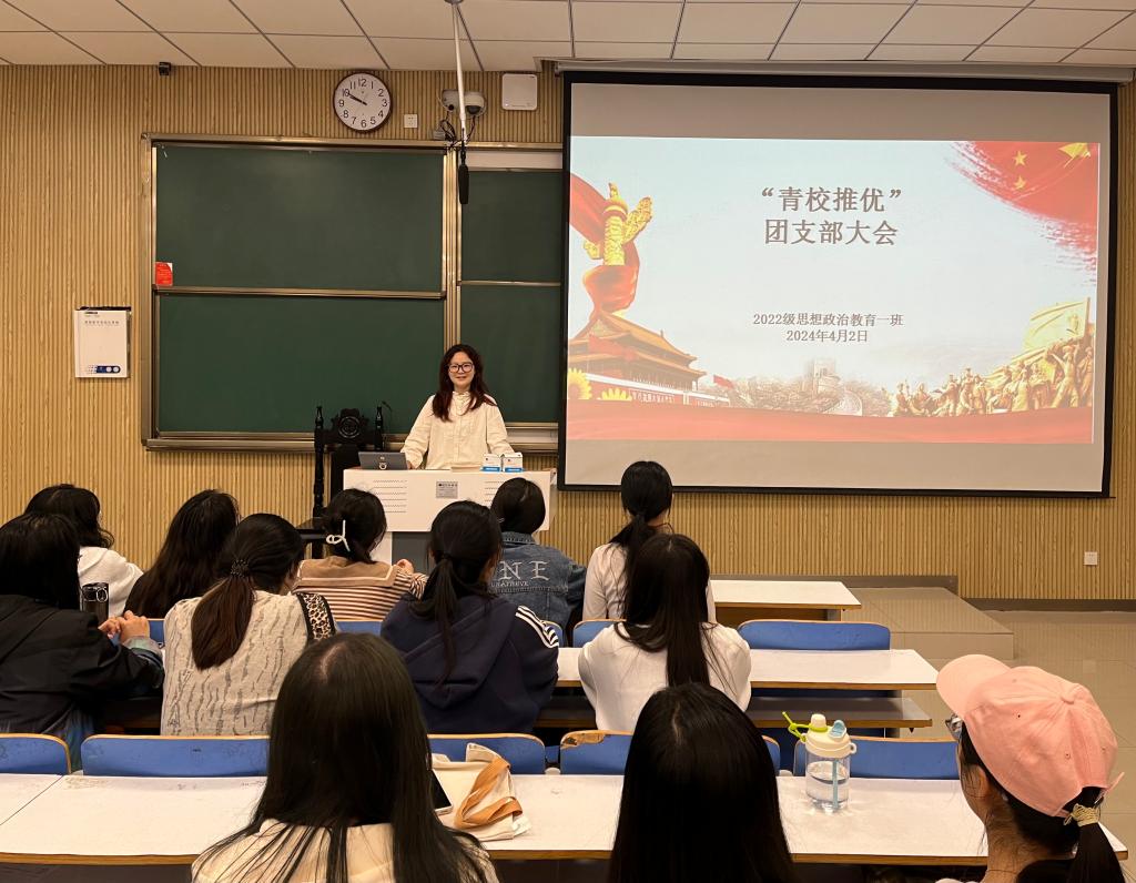4月2日上午,太阳集团tyc59972022级思想政治教育一班在社科楼515教室召开“青校推优”团支部大会,我院2022级思想政治教育一班全体同学共同参与本次会议,会议由团支书李佳茹主持。