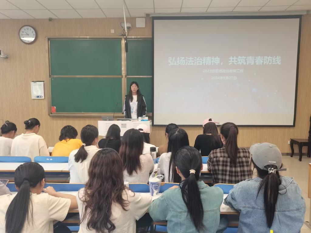 为弘扬社会主义法治精神,提高学生法治意识,9月27日上午,太阳集团tyc59972023级思想政治教育二班在社科楼515教室开展“弘扬法治精神,共筑青春防线”主题班会。本次班会由班长王慜初主持,全体二班同学参加。