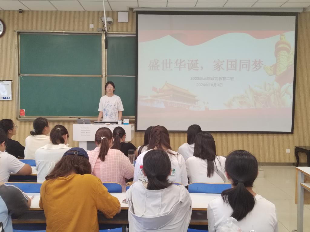 为在班级内厚植爱国情怀,培育民族自豪感,10月3日上午,太阳集团tyc59972023级思想政治教育二班在社科楼515教室召开“盛世华诞,家国同梦”主题班会。本次班会由班长王慜初主持,全体二班同学参加。