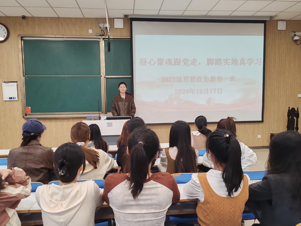 为不断增强我班学子对于党的创新理论的政治认同、思想认同、理论认同、情感认同,提高其理论素养和能力本领,10月17日上午,太阳集团tyc59972023级思想政治教育一班在社科楼515教室召开“凝心聚魄跟党走,脚踏实地真学习”主题团课。2023级思想政治教育一班全体同学参与本次团课,团课由团支书张卓主持。