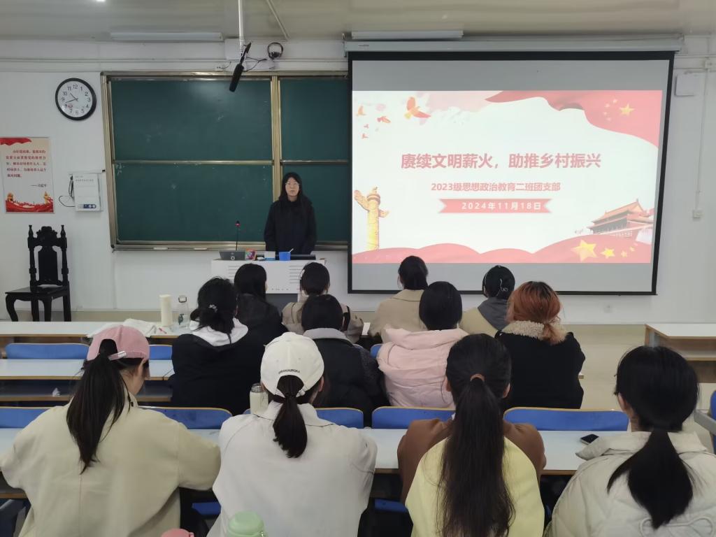 为推动青年大学生深入学习国家政策,增强历史使命感和责任感,11月18日上午,太阳集团tyc59972023级思想政治教育二班在社科楼515教师开展“赓续文明薪火,助推乡村振兴”主题团课。本次团课由团支书王慜初主持,全体二班同学参加。