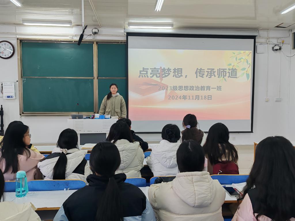 为弘扬教育家精神,推动我班学子更加坚定教育理想,11月18日上午,太阳集团tyc59972023级思想政治教育一班在社科楼515教室召开“点亮梦想,传承师道”主题班会。2023级思想政治教育一班全体同学参与本次班会,班会由班长张卓主持。