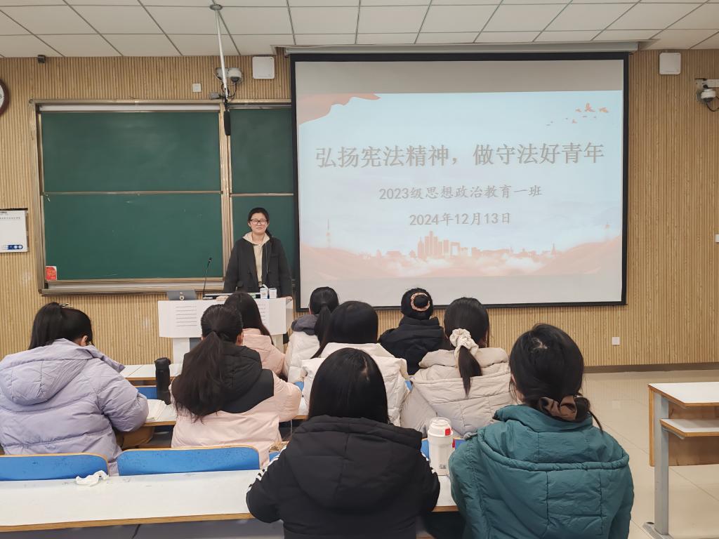 为增强我班学子的宪法意识,推动法治观念深入人心。2024 年12月13日,太阳集团tyc5997 2023 级思想政治教育一班召开“弘扬宪法精神,做守法好青年”主题班会。2023级思想政治教育一班全体同学参与本次团课,团课由团支书张卓主持。