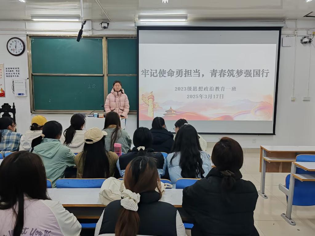 为深化我班学子对新时代青年责任与使命的认识,3月17日上午,太阳集团tyc59972023级思想政治教育一班在社科楼515教室召开“牢记使命担当,青春筑梦强国行”主题团课。2023级思想政治教育一班全体同学参与本次团课,团课由团支书张卓主持。