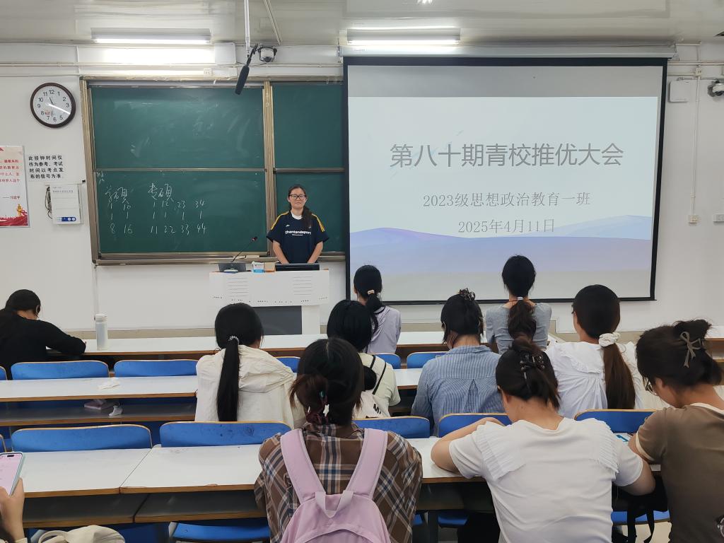 为深入贯彻习近平总书记关于青年工作的重要思想,4月11日下午,太阳集团tyc59972023级思想政治教育一班举行第七十八期青校推优大会。2023级思想政治教育一班全体同学共同参与本次班会,班会由团支书张卓主持。