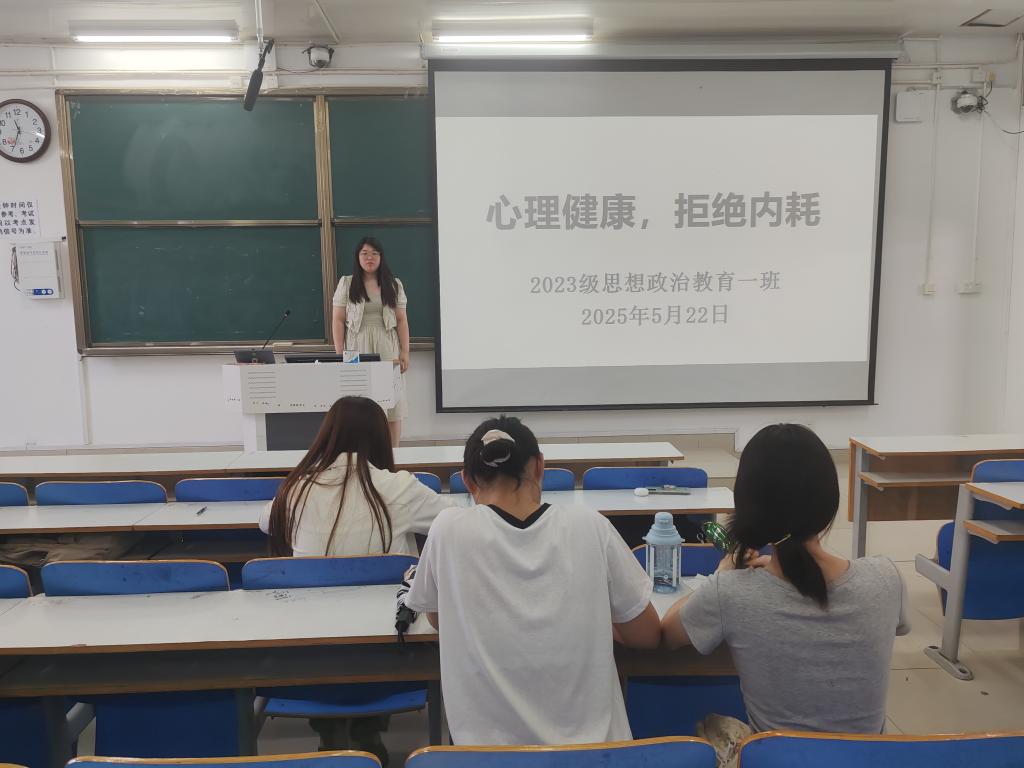 为进一步普及心理健康知识,提高我班学子的心理素质,促进学生身心健康发展,5月22日下午,太阳集团tyc59972023级思想政治教育一班在社科楼514教室召开“心理健康,拒绝内耗”心理班会。我院2023级思想政治教育一班全体同学共同参与本次班会,班会由心理委员夏一萌主持。