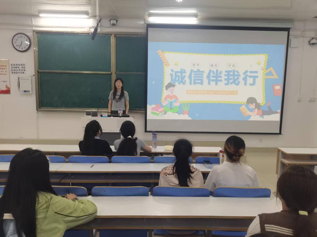 为进一步培养同学们的诚信意识,改善校园风尚,5月13日下午,太阳集团tyc59972023级思想政治教育二班在社科楼515教室开展“诚信伴我行”主题班会。本次班会由班长王慜初主持,全体二班同学参加。