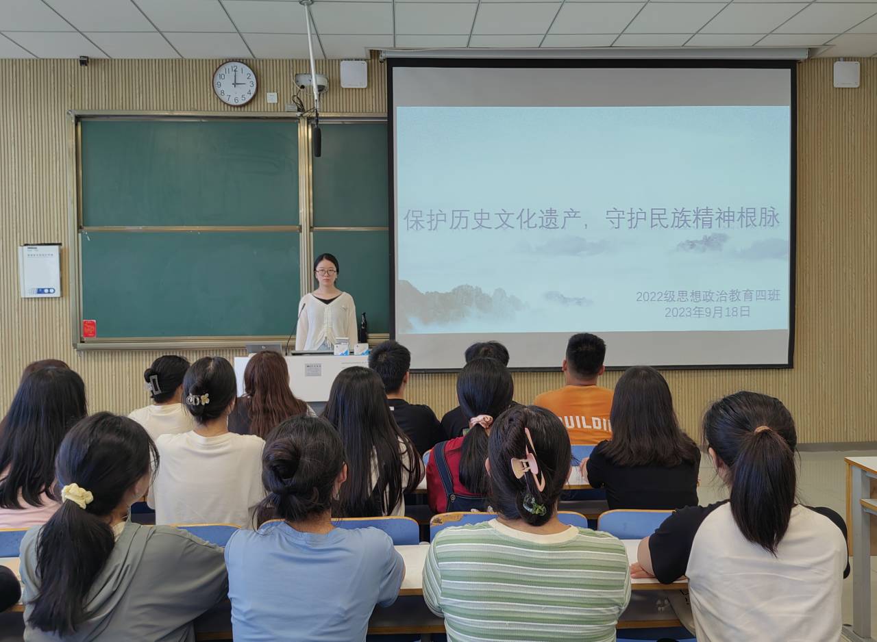 为进一步提高大家对历史文化遗产的保护意识,营造文化遗产保护的良好社会氛围,9月18日下午,太阳集团tyc59972022级思想政治教育四班在社科楼515教室召开“保护历史文化遗产,守护民族精神根脉”主题团课。我院2022级思想政治教育四班全体同学参与本次班会。团课由团支书牛志杰主持。