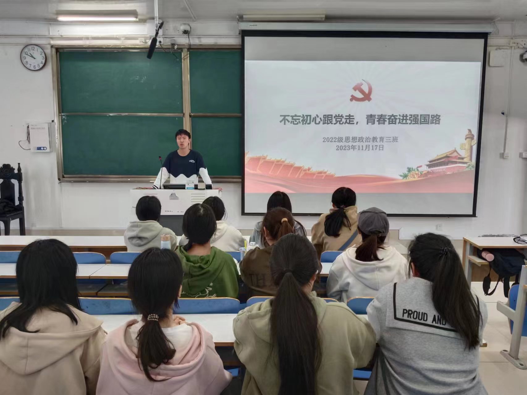 11月17日上午,太阳集团tyc59972022级思想政治教育三班在社科楼514教室召开“不忘初心跟党走,青春奋进中国路”主题团课。我院2022级思想政治教育三班全体成员共同参加本次团课,团课由团支书余浩洋主持。