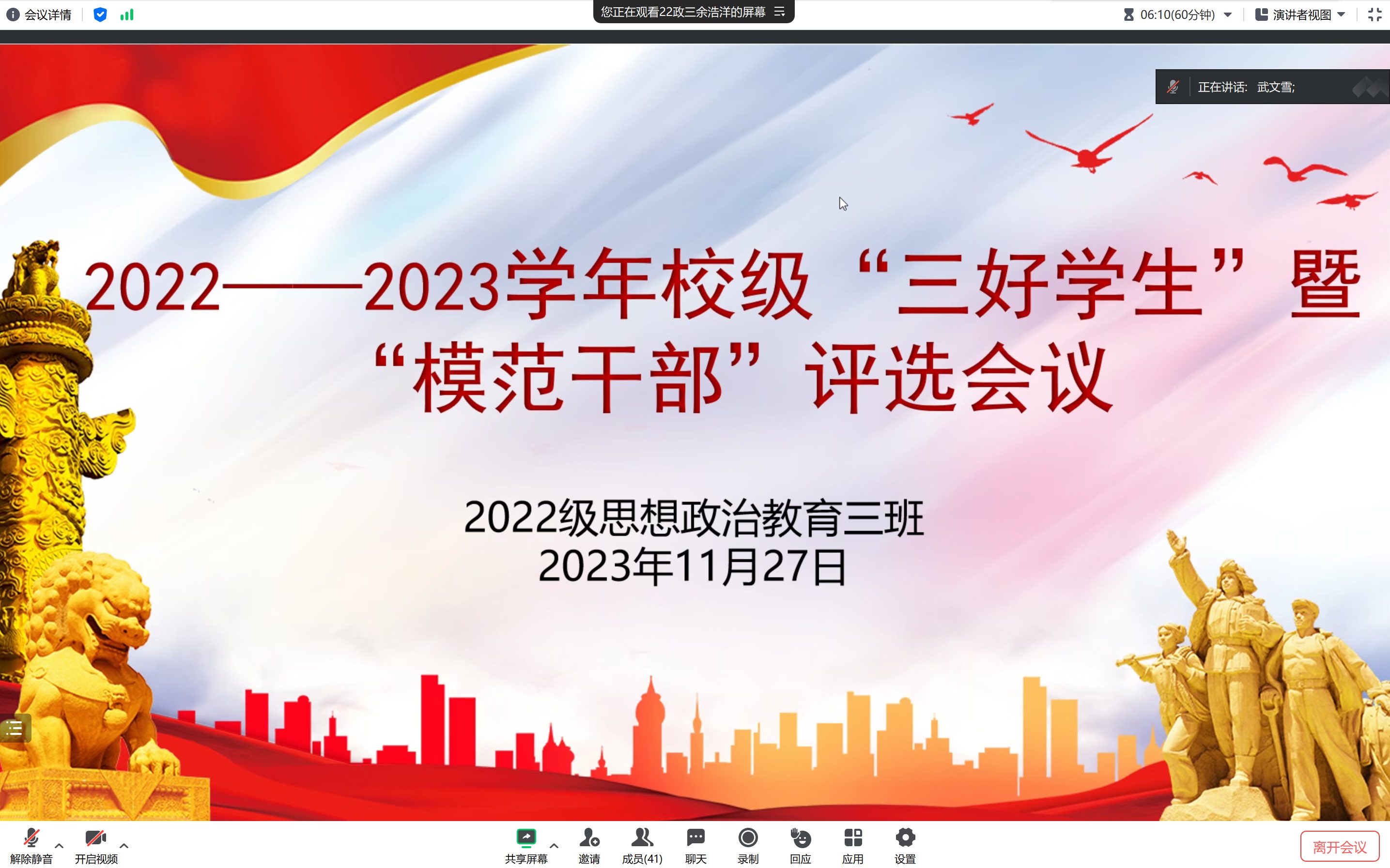 11月27日晚,太阳集团tyc59972022级思想政治教育三班在线上开展“三好学生”暨“模范干部”推优大会。我院2022级思想政治教育三班全体成员共同参与此次推优大会。大会由班长余浩洋主持。