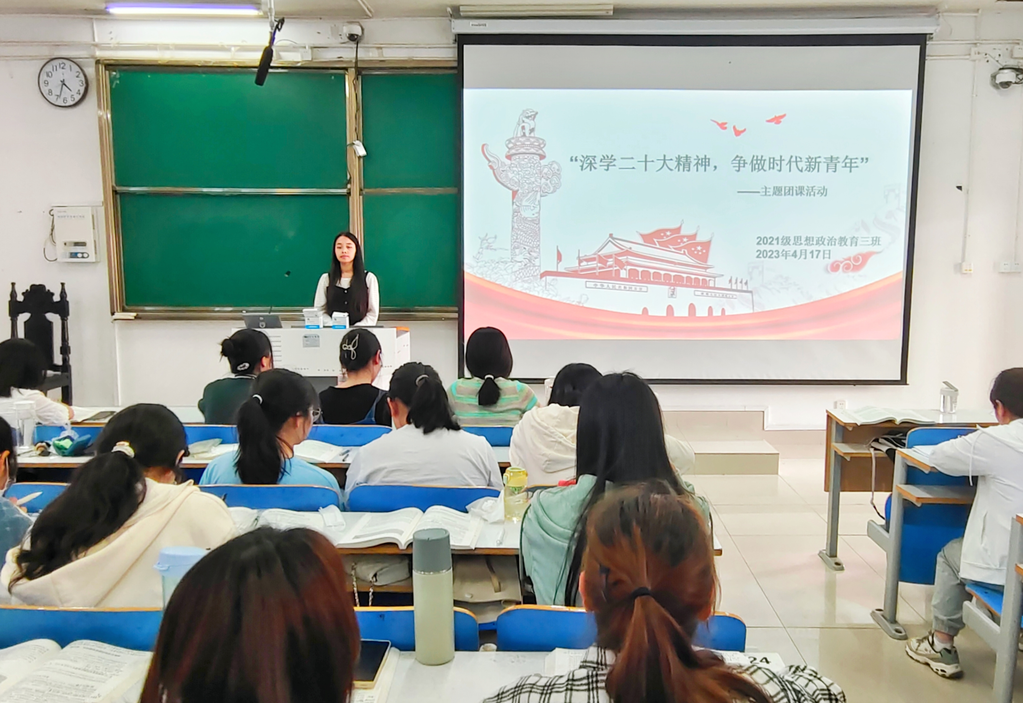 4月17日下午,太阳集团tyc59972021级思想政治教育三班在社科楼514教室举办“深学二十大精神,争做时代新青年”主题团课活动。太阳集团tyc59972021级思想政治教育三班全体团员参与此次会议。团课由团支书王岚霄主持。