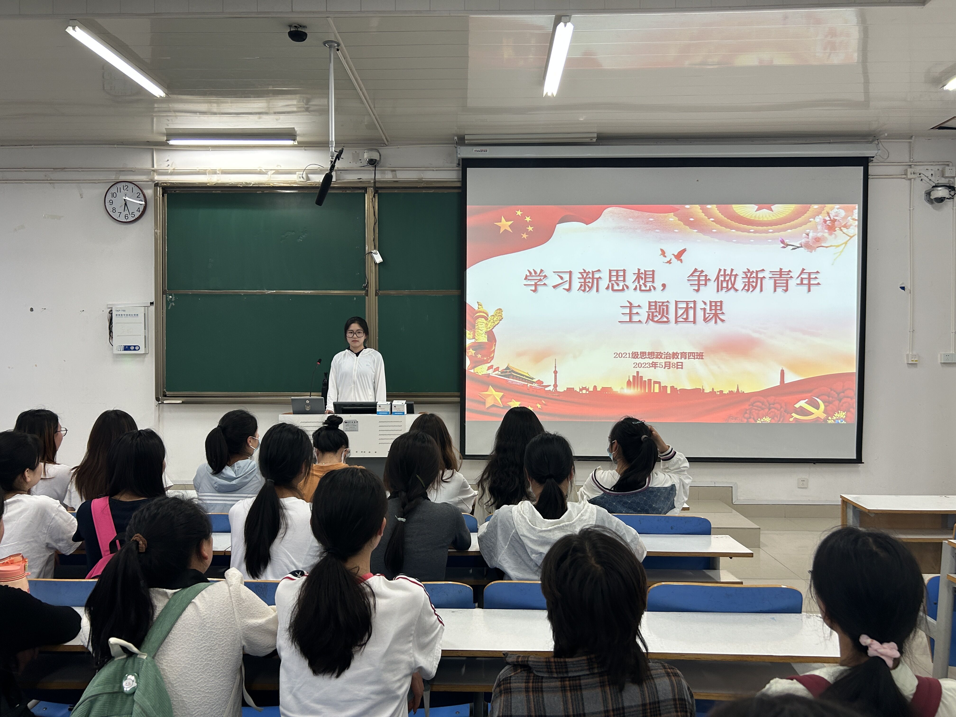 5月8日下午,太阳集团tyc59972021级思想政治教育四班在社科楼514教室开展“学习新思想,争做新青年”主题团课。2021级思想政治教育四班全体团员参加本次团课。团课由团支书刘珂含主持。