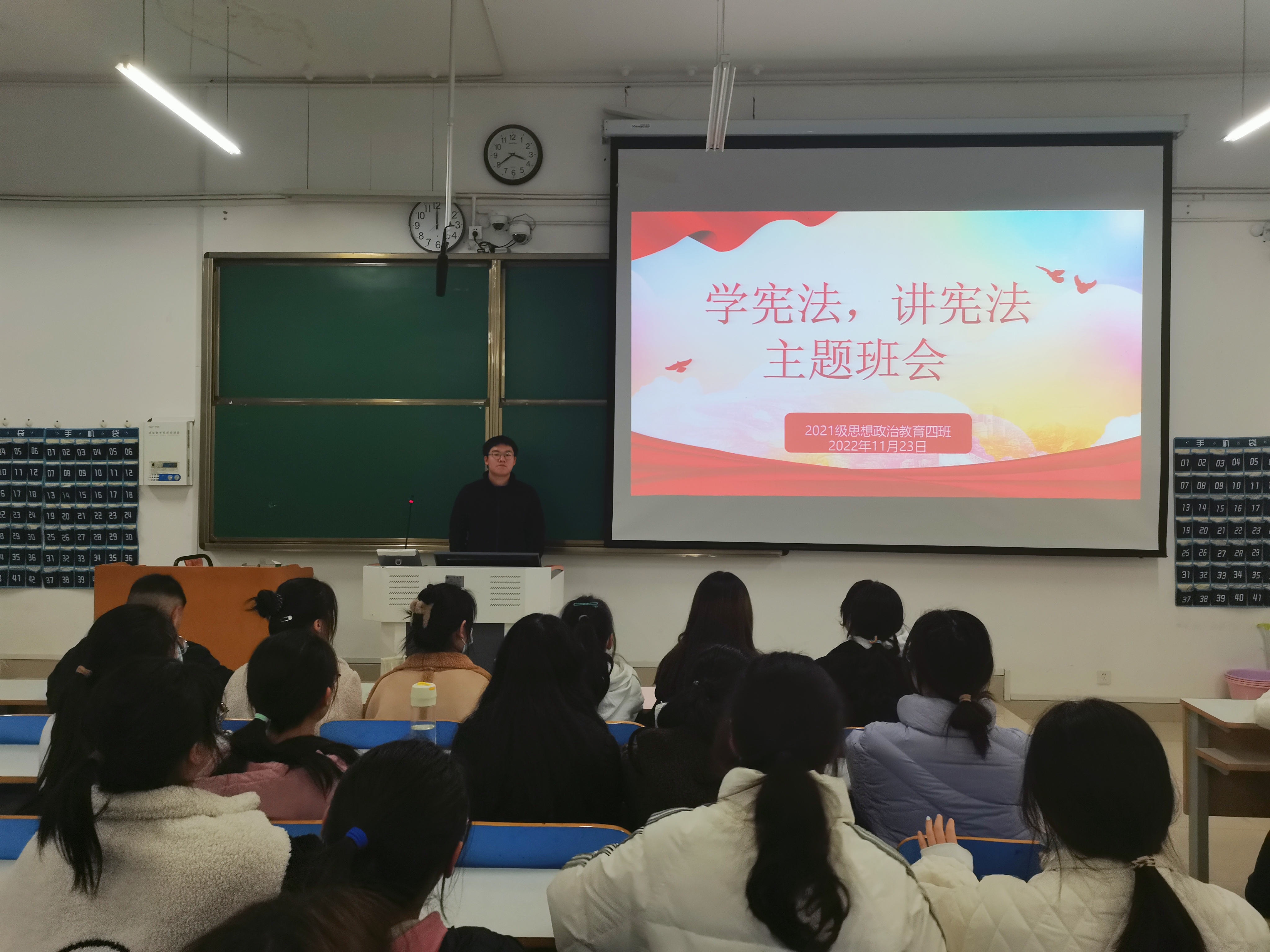 为深入学习习近平新时代中国特色社会主义思想,大力弘扬宪法精神,11月23日下午,太阳集团tyc59972021级思想政治教育四班在社科楼516教室开展“学宪法,讲宪法”主题班会。2021级思想政治教育四班全体同学参加本次班会。班会由副班长常康哲主持。