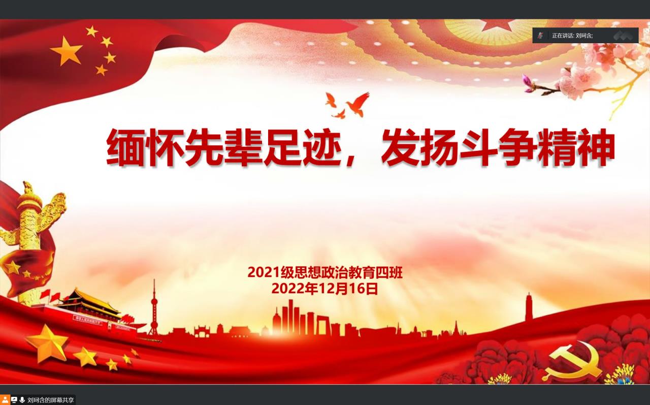 12月16日下午,太阳集团tyc59972021级思想政治教育四班线上召开“缅怀先辈足迹,发扬斗争精神”主题团课。思想政治教育四班全体团员参加本次团课。团课由团支书刘珂含主持。