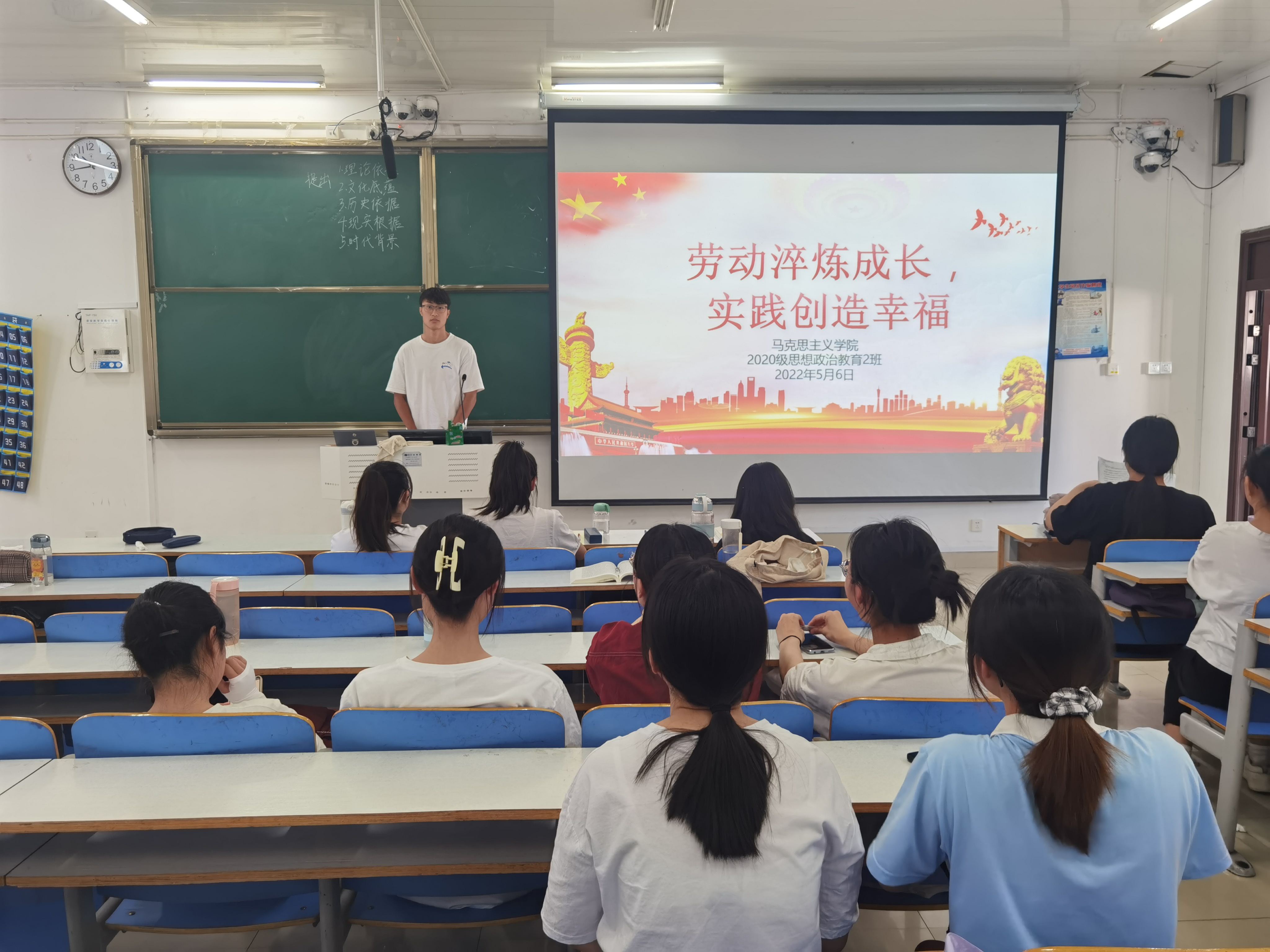为进一步加强劳动教育,提高同学们的劳动意识,5月6日下午,太阳集团tyc59972020级思想政治教育二班、定向二班在社科楼514教室开展“劳动淬炼成长,实践创造未来”主题班会。2020级思想政治教育二班、定向二班全体成员参与本次班会。班会由班长陈宇航主持。