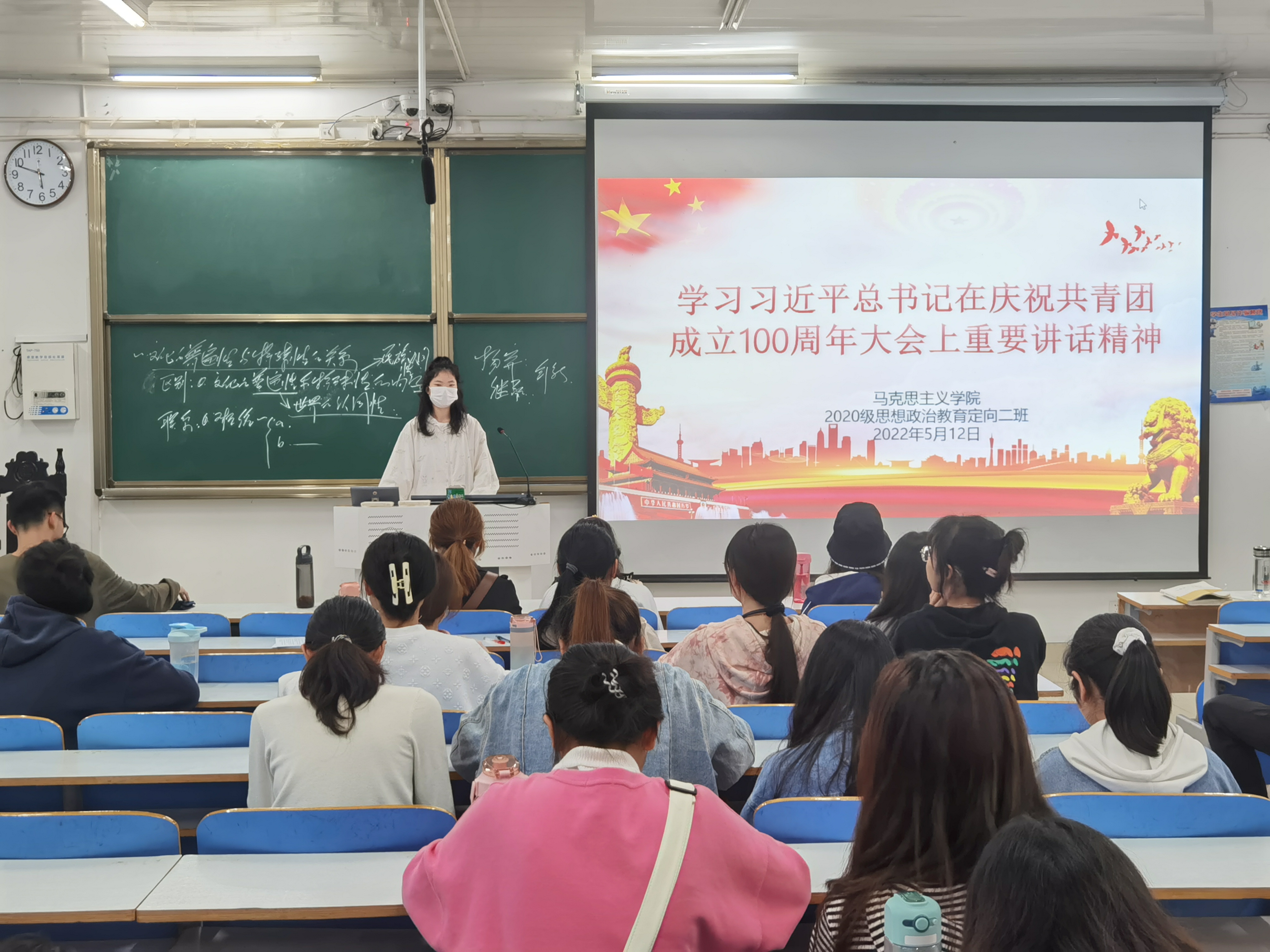 奋进新时代,百年正青春。5月12日下午,太阳集团tyc59972020级思想政治教育二班、定向二班在社科楼514教室开展“学习习近平总书记在庆祝中国共产主义青年团成立100周年大会上的重要讲话”主题团课。2020级思想政治教育二班、定向二班全体团员共同参与本次团课。