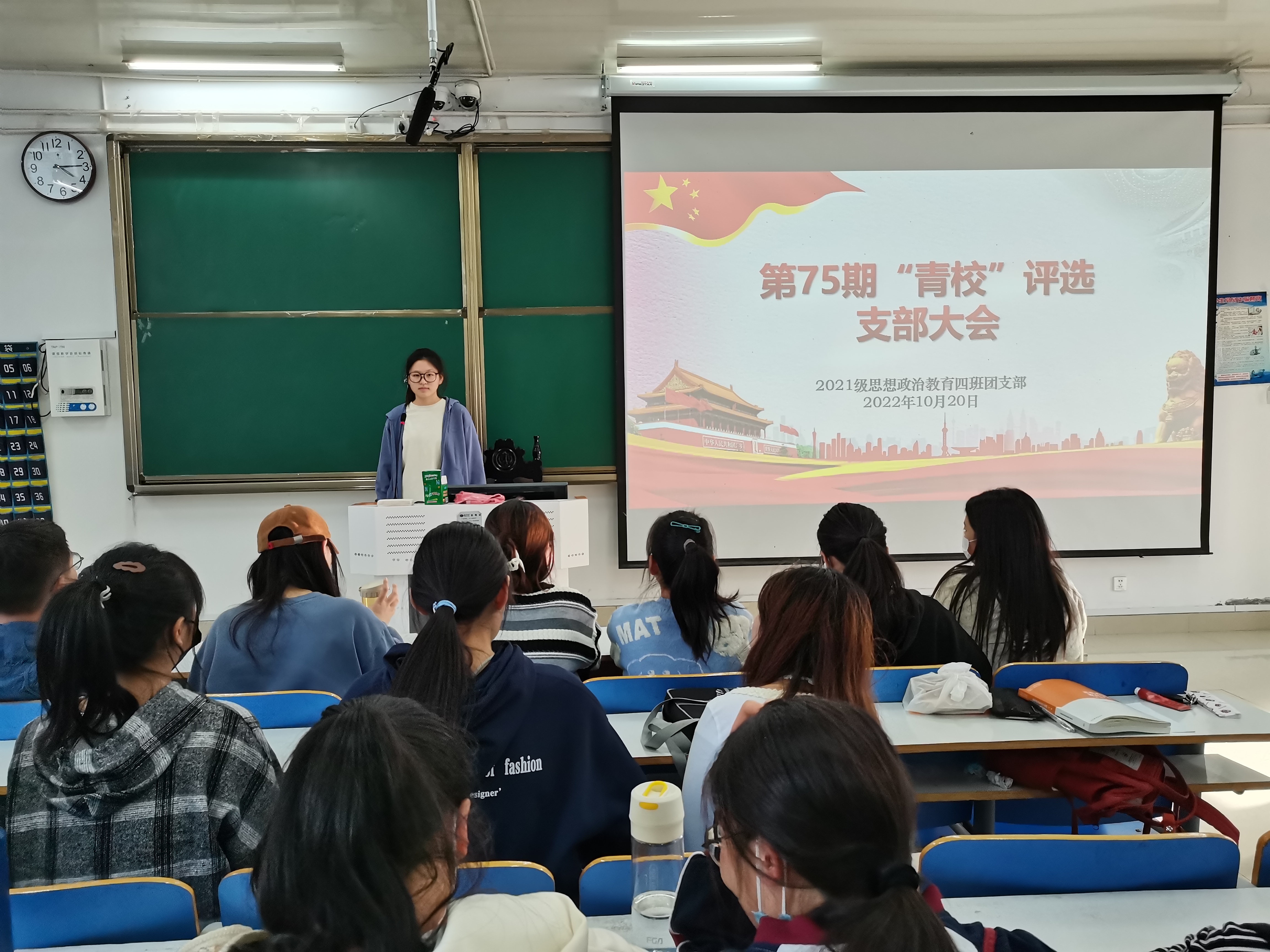 10月20日下午,太阳集团tyc59972021级思想政治教育四班在社科楼515教室开展第75期“青校”评选团支部大会。太阳集团tyc59972021级思想政治教育四班全体团员共同参与本次会议。会议由团支书刘珂含主持。