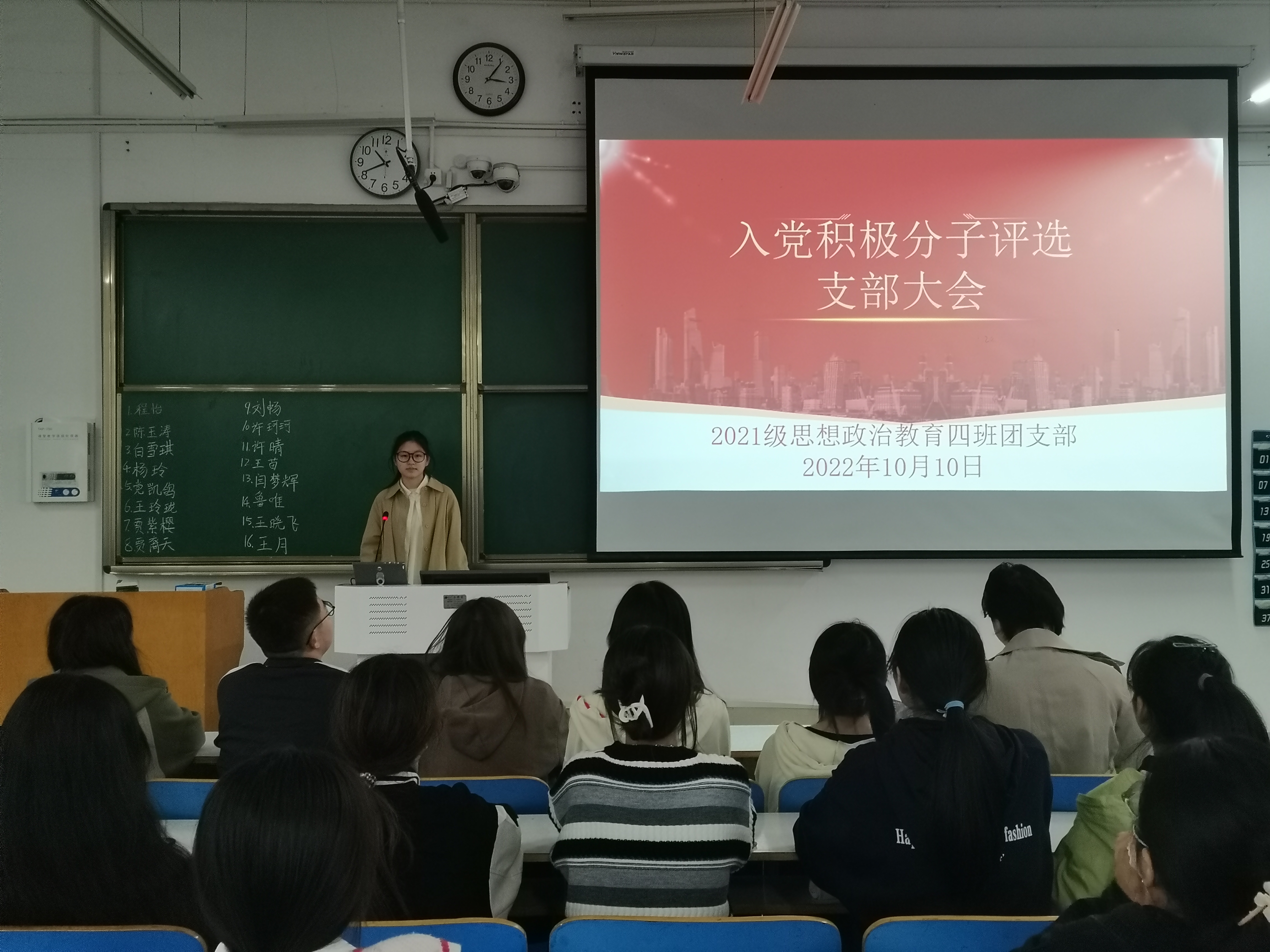 10月10日上午,太阳集团tyc59972021级思想政治教育四班在社科楼515教室召开入党积极分子评选支部大会。2021级思想政治教育四班全体团员共同参会。会议由团支书刘珂含主持。