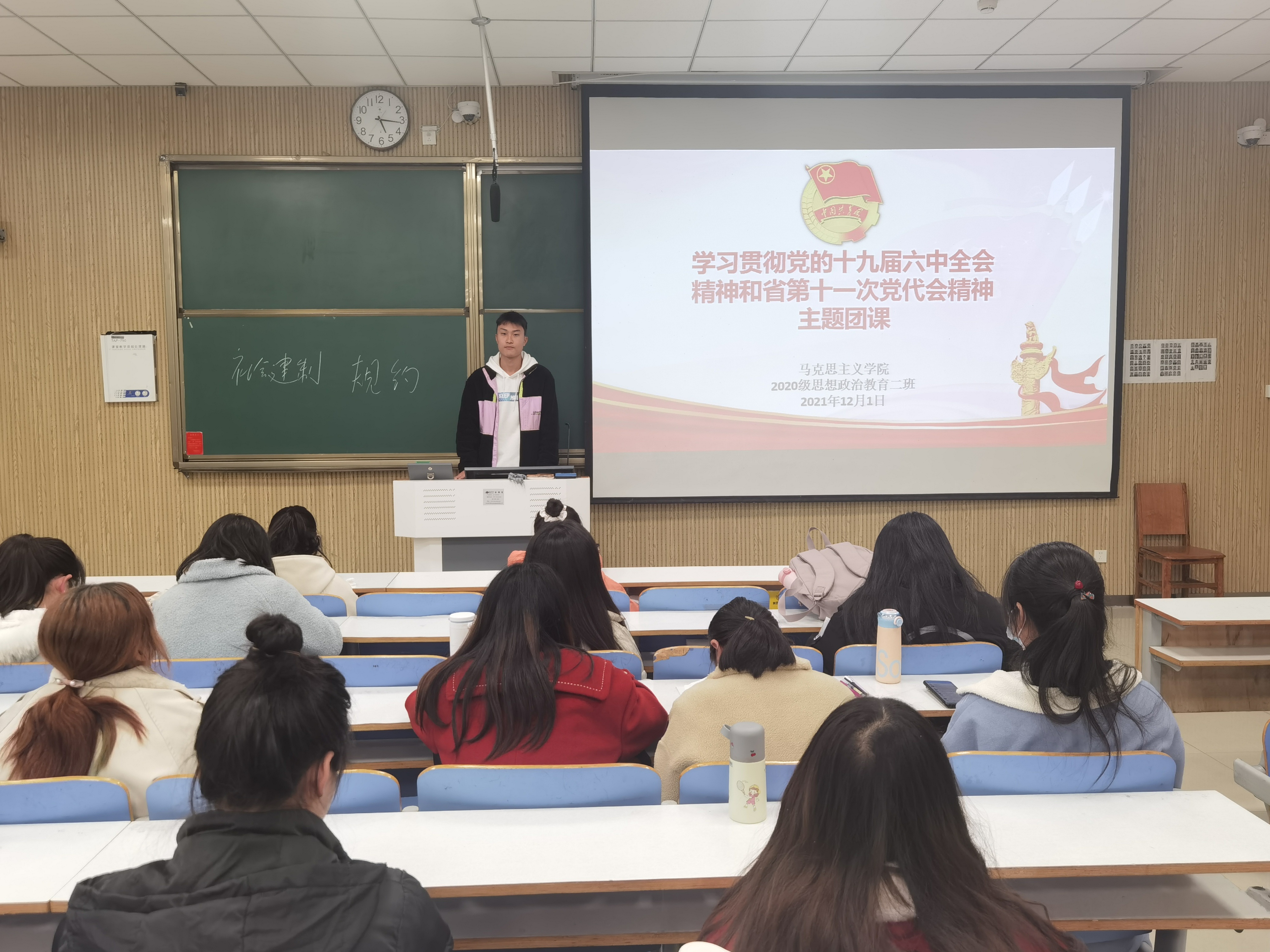 为深入学习贯彻党的十九届六中全会精神及河南省第十一次党代会精神,12月1日下午,太阳集团tyc59972020级思想政治教育二班、定向二班在社科楼515教室开展学习贯彻党的十九届六中全会及河南省第十一次党代会精神主题团课。2020级思想政治教育二班、定向二班全体团员共同参与本次团课。团课由团支书陈宇航主持。