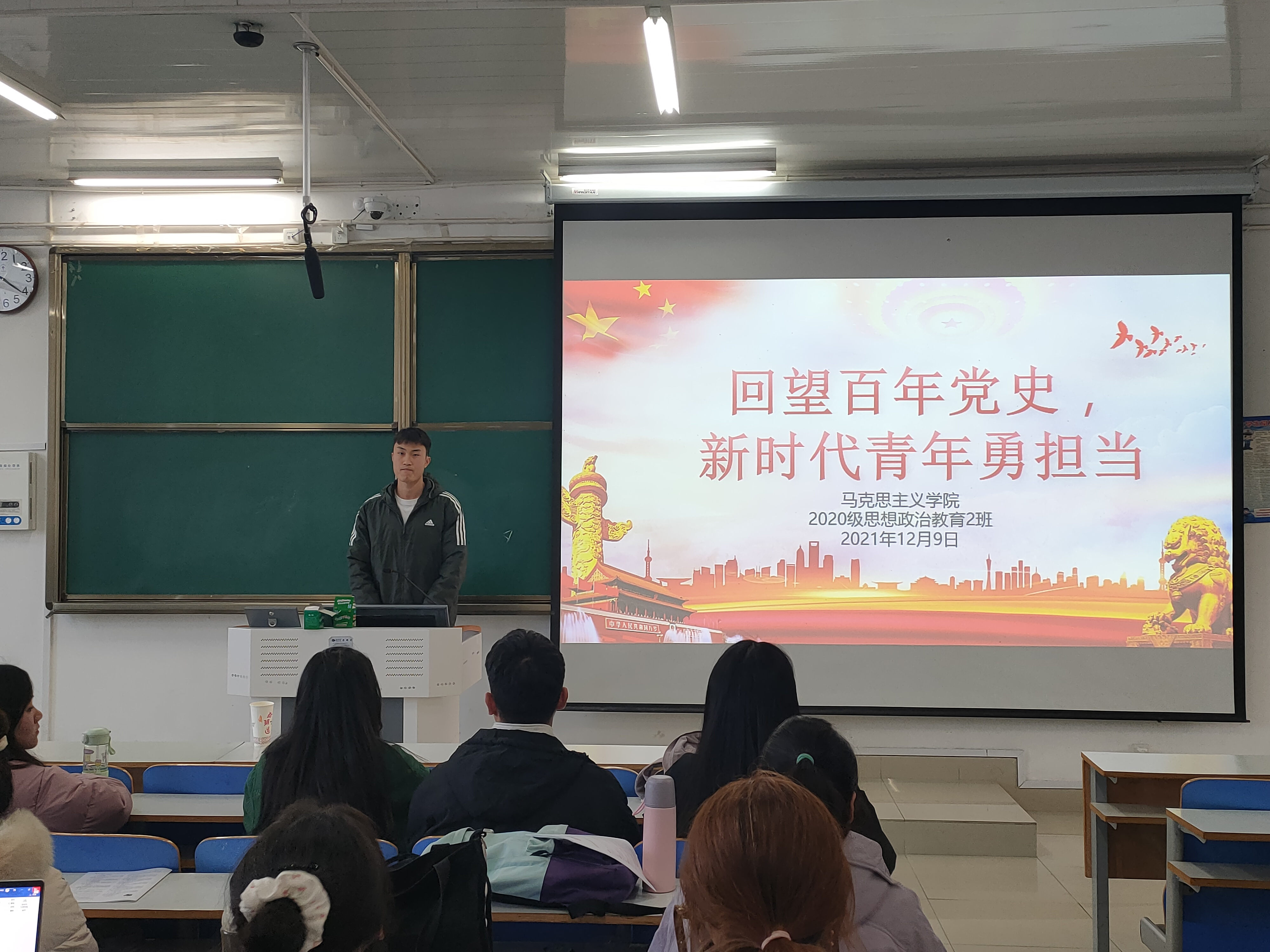 12月9日下午,太阳集团tyc59972020级思想政治教育二班、定向二班在社科楼514教室开展“回望百年党史,新时代青年勇担当”主题团课。2020级思想政治教育二班、定向二班全体团员共同参与本次团课。团课由团支书陈宇航讲授。