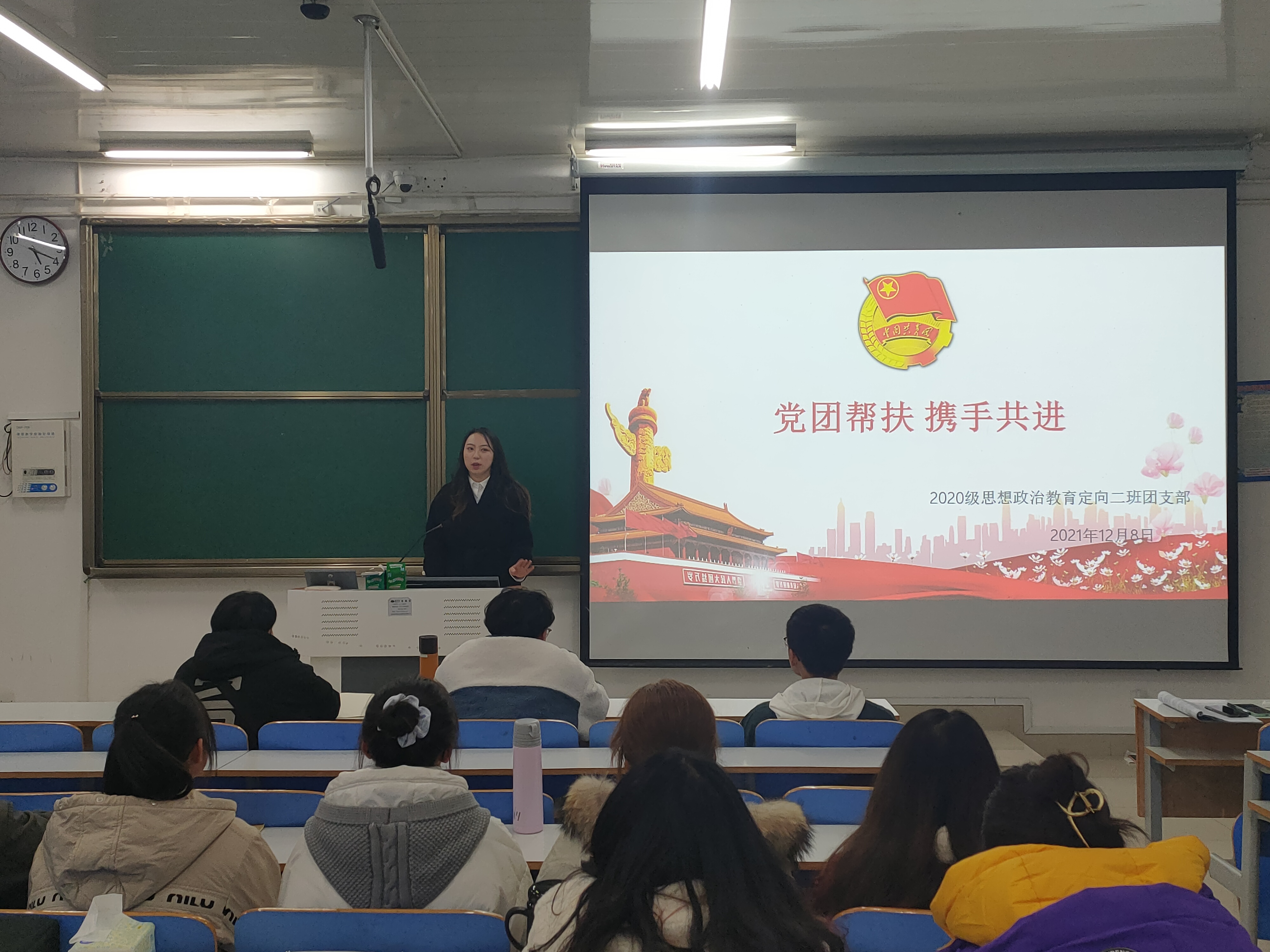 12月8日下午,太阳集团tyc59972020级思想政治教育定向二班在社科楼514教室召开党团帮扶主题班会。2018级预备党员赵思雨、2019级预备党员宋羽潇和2020级思想政治教育定向二班全体团员共同参与本次班会。班会由副班长高红凯主持。