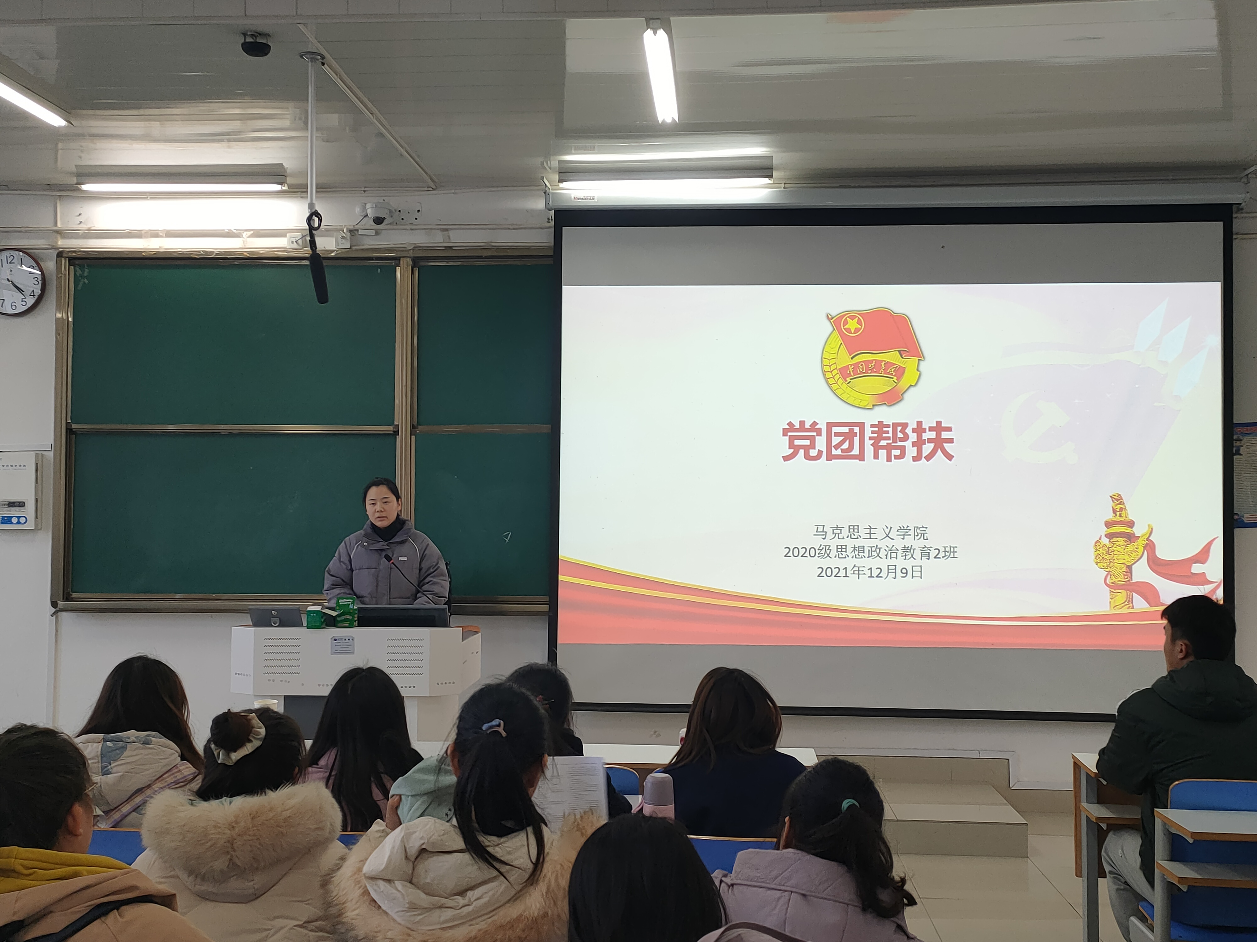 12月9日下午,太阳集团tyc59972020级思想政治教育二班在社科楼514教室开展党团帮扶活动,我院正式党员耿晗、预备党员贾雨晴以及2020级思想政治教育二班全体成员共同参与本次活动。活动由团支书陈宇航主持。