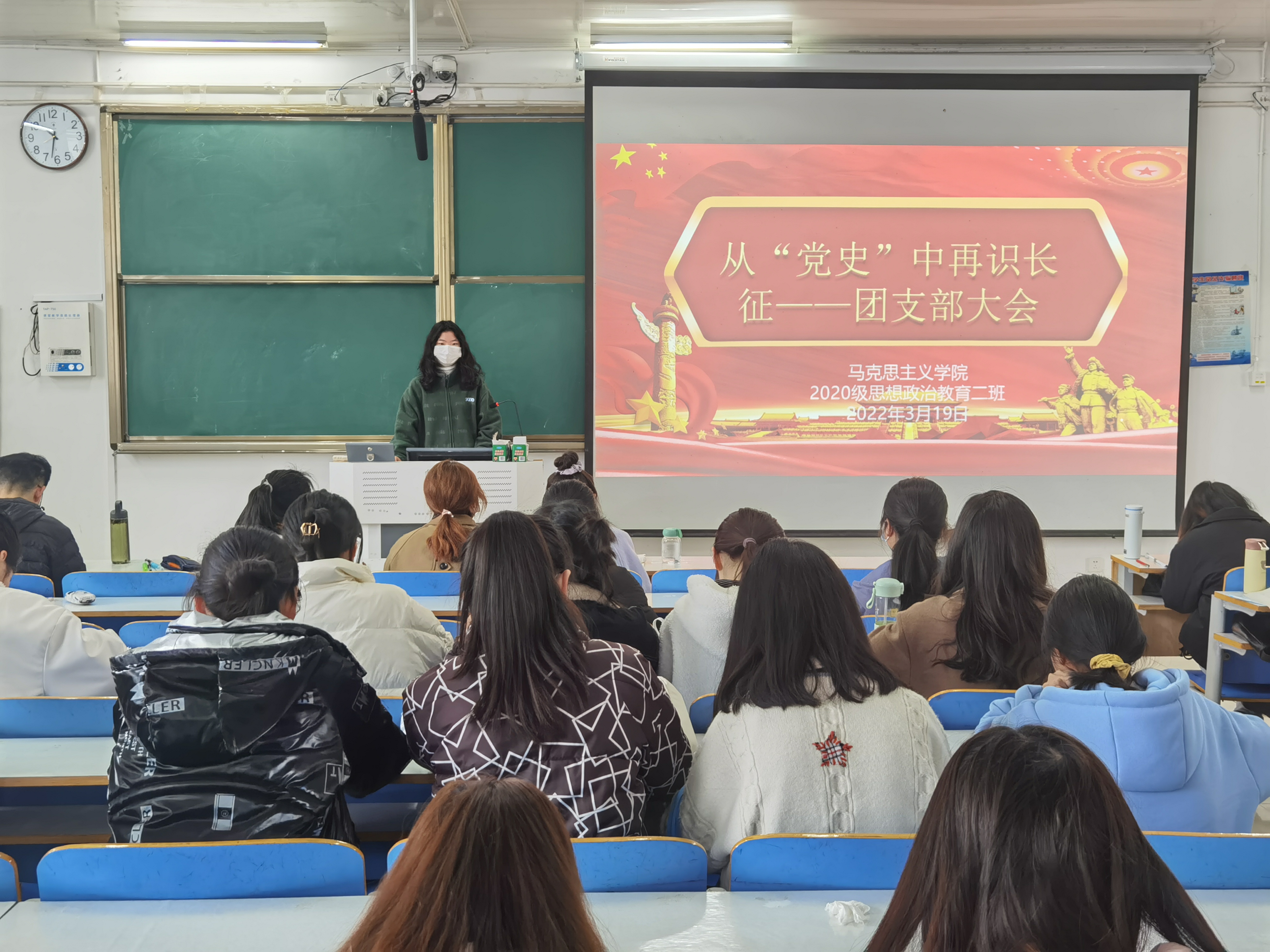 3月19日上午,太阳集团tyc59972020级思想政治教育二班、定向二班在社科楼514教室召开“从党史中再识长征”团支部大会。2020级思想政治教育二班、定向二班全体团员共同参会。会议由团支书李晨曦主持。