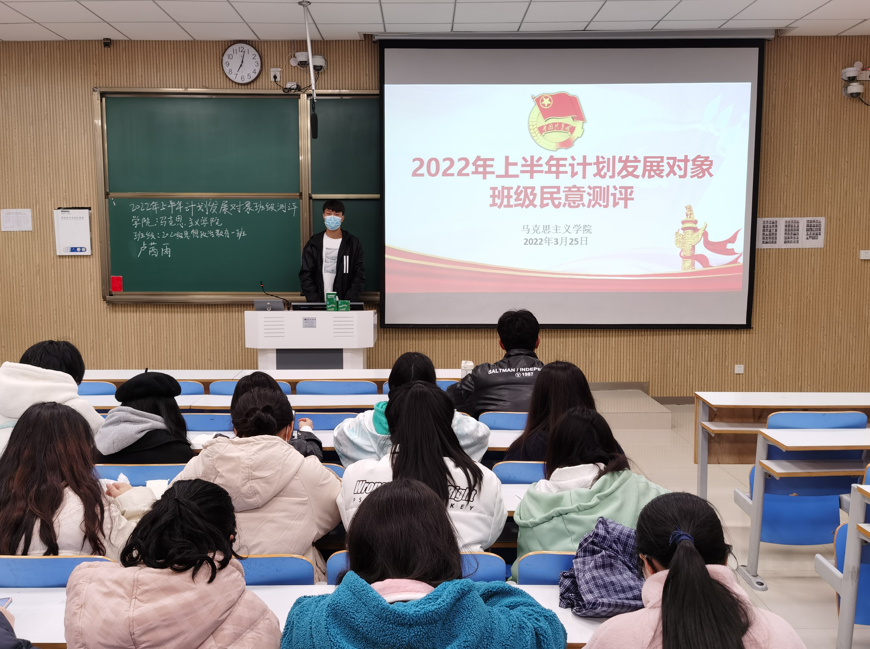 为进一步发展壮大党员队伍,为党支部注入新的活力,3月25日晚,太阳集团tyc59972020级思想政治教育二班在社科楼515教室召开2022年上半年党员计划发展对象班级民意测评会。2020级思想政治教育二班全体团员共同参加本次会议。会议由团支书陈宇航主持。