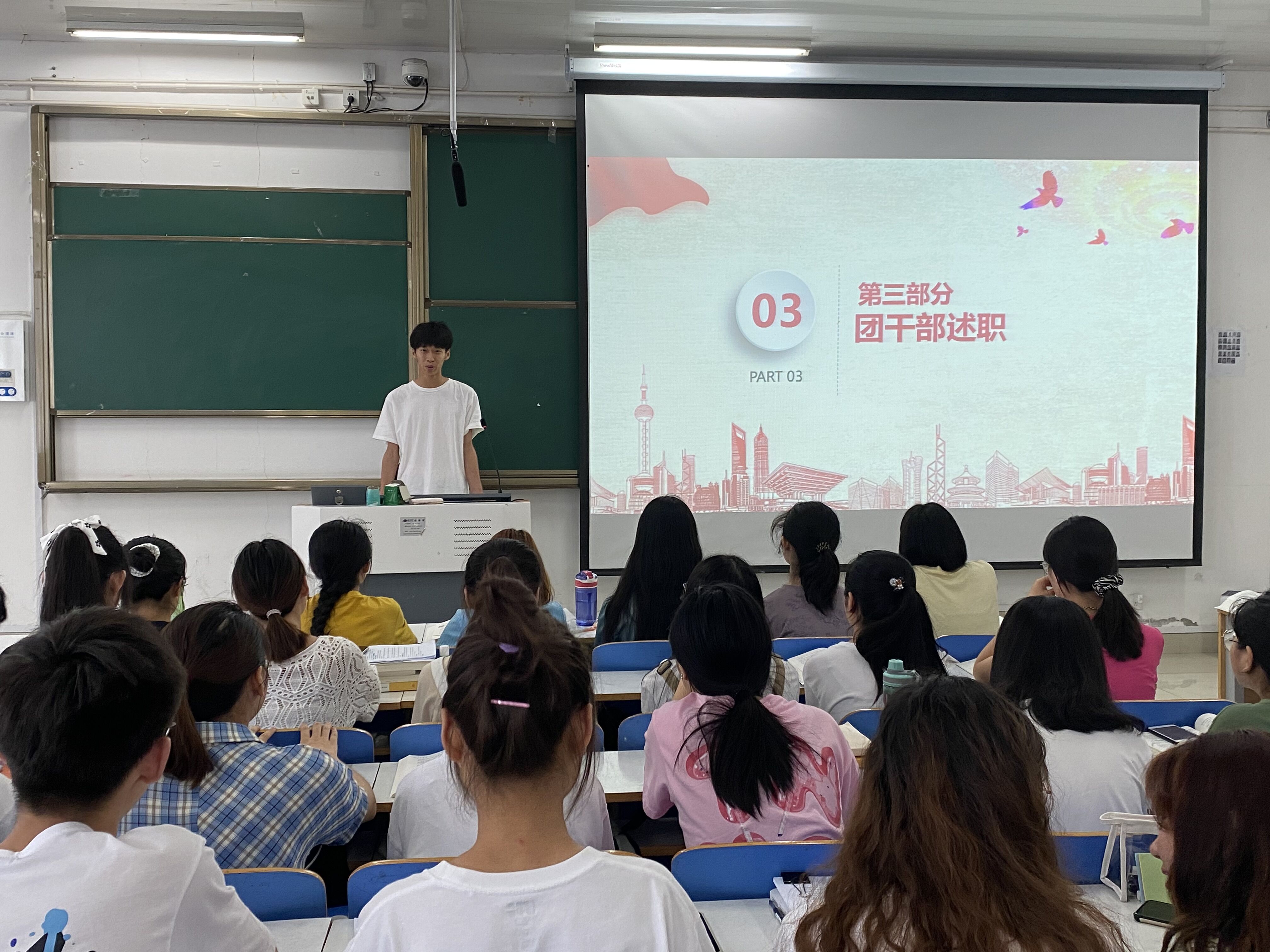 会议分为两个部分。首先,班长吕昂从“五个总体原则”、“六大主要内容”对暑期“三下乡”社会实践活动展开详细阐述,鼓励大家积极参与,知行共进。接着,各班干部进行述职报告。工作中的经验是财富,工作中的教训也是财富,关键在于是否善于总结。各班委就两年来完成班级工作任务的具体情况进行自我回顾、评估、鉴定和反思的口述报告。主题明晰,分析客观,态度真诚。其中,学习委员王明亮总结并分享工作经验,他希望自己能永葆初心,与大家继续同行奋进。最后,陶青青对会议作出总结。她指出,各班委据实议事,反省到位,情感真挚值得欣慰,并进一步强调,班委应继续严于律己,做好表率,与同学们一起砥砺品质、积累经验、磨练意志,为将来行稳致远练好基本功。