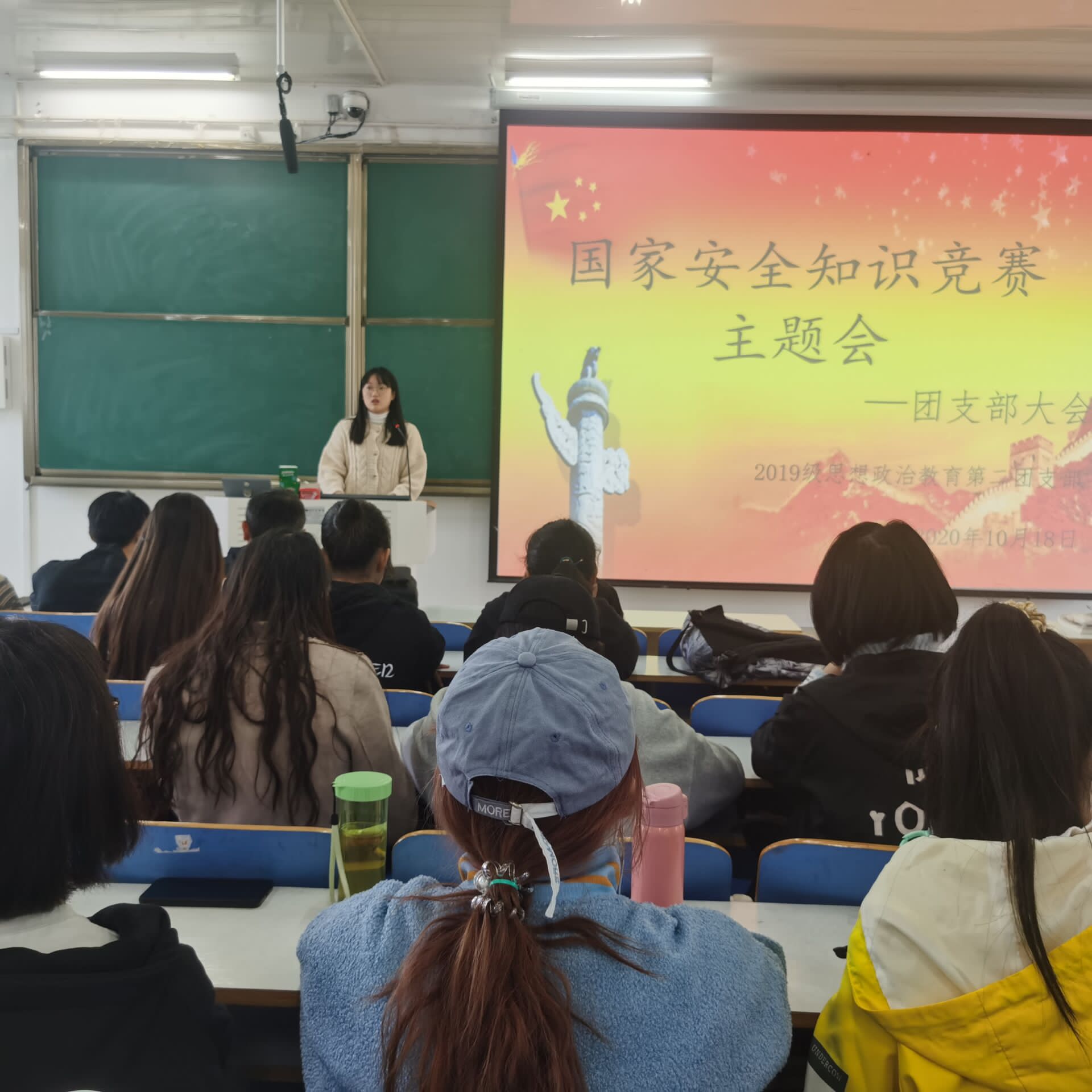 10月19日下午,太阳集团tyc59972019级思想政治教育二班在社科楼516教室召开“国家安全知识竞赛”主题团课。2019级思想政治教育二班全体成员共同参会。会议由团支书孙雅娴主持。