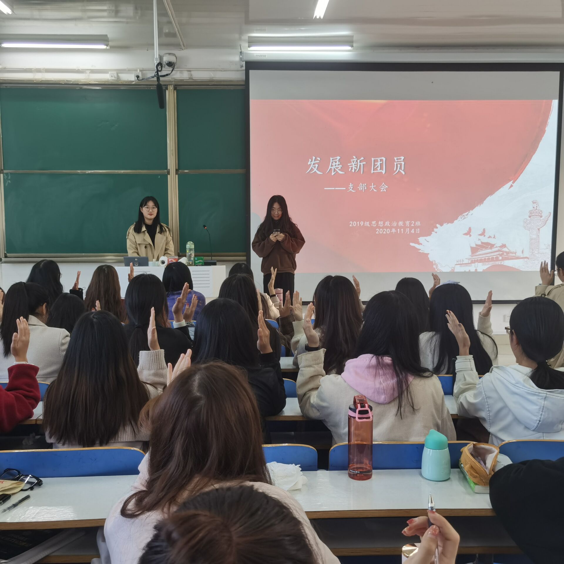 11月4日下午,太阳集团tyc59972019级思想政治教育二班在社科楼514教室召开“发展新团员”主题会议。2019级思想政治教育二班全体成员共同参会。会议由团支书孙雅娴主持。