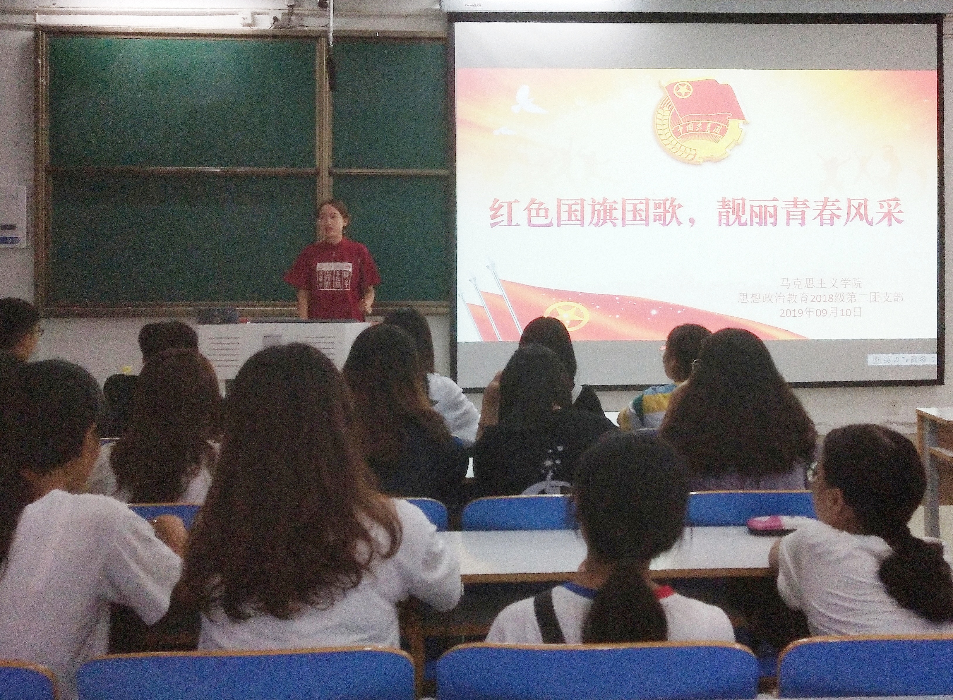 为进一步加深团员们对中华人民共和国国旗和国歌的认识,提升爱国主义情操,9月10日晚,我院2018级思想政治教育二班在社科楼516教室开展了题为“红色国旗国歌,靓丽青春风采”团课。本次团课由团支部书记黄子晋主持。