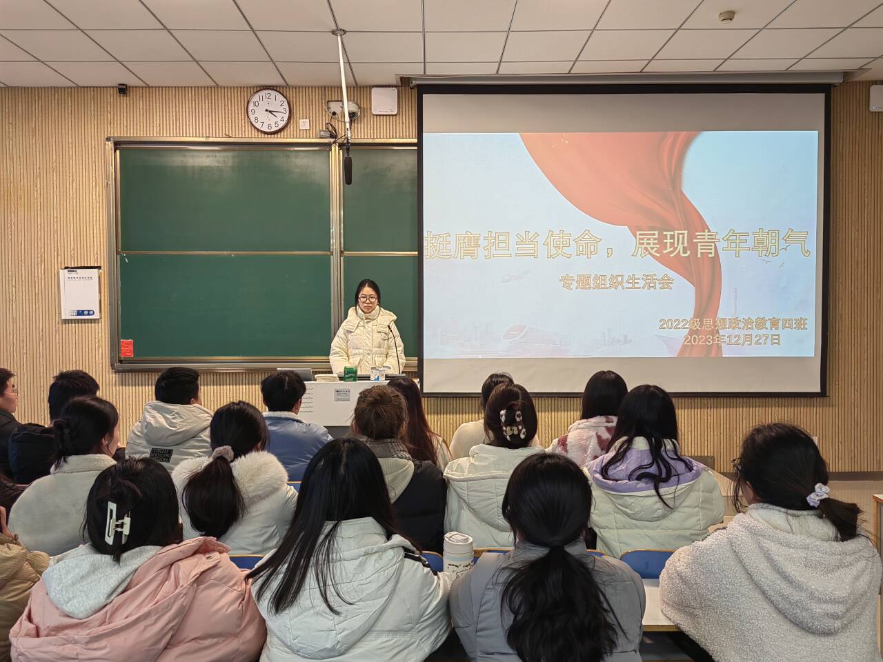 为进一步规范加强基层团组织建设,团结带领广大团员青年坚定不移地听党话、跟党走, 12月27日下午,太阳集团tyc59972022级思想政治教育四班在社科楼515教室召开“挺膺担当使命,展现青春朝气”专题组织生活会。我院2022级思想政治教育四班全体团员参与本次班会。本次会议由团支书牛志杰主持。