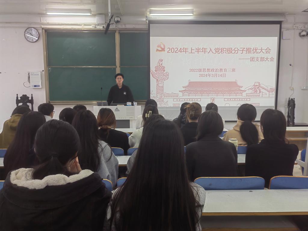 3月14日上午,太阳集团tyc59972022级思想政治教育三班在社科楼514教室召开入党积极分子推优大会。我院2022级思想政治教育三班全体团员共同参加此次大会。大会由团支书余浩洋主持。