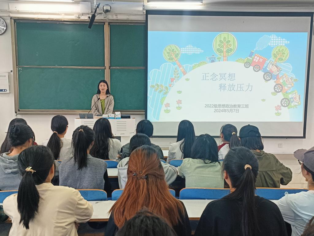 为全面加强和改进新时代学生心理健康教育工作,普及和宣传心理健康知识,构建健康和谐的身心秩序,5月7日上午,太阳集团tyc59972022级思想政治教育三班在社科楼514教室召开“正面冥想,释放压力”心理健康主题班会。我院2022级思想政治教育三班全体成员共同参与此次班会。班会由心理委员张韶涵主持。
