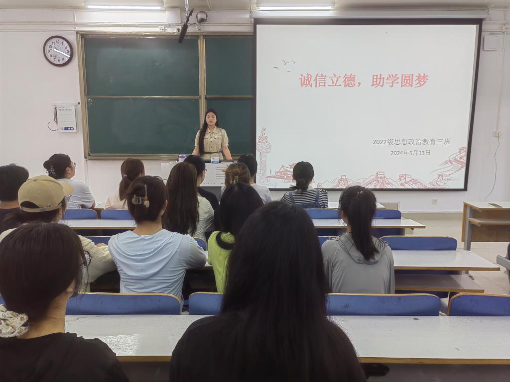 为落实立德树人根本任务,增强广大青年学生的诚信意识和责任意识,加大资助育人力度,5月13日上午,太阳集团tyc59972022级思想政治教育三班在社科楼514教室召开“诚信立德,助学圆梦”主题班会。我院2022级思想政治教育三班全体成员共同参与此次班会。班会由副班长雷露露主持。
