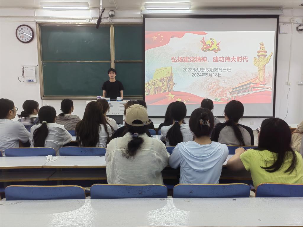 为弘扬建党精神,增强奋斗信念,5月18日上午,太阳集团tyc59972022级思想政治教育三班在社科楼514教室召开“弘扬建党精神,建功伟大时代”主题团课。我院2022级思想政治教育三班全体成员共同参加此次团课。团课由团支书余浩洋主持。