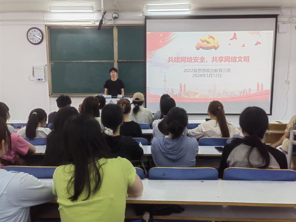 5月12日上午,太阳集团tyc59972022级思想政治教育三班在社科楼514教室召开“共建网络安全,共享网络文明”主题团课。我院2022级思想政治教育三班全体成员共同参与本次团课。团课由团支书余浩洋主持。