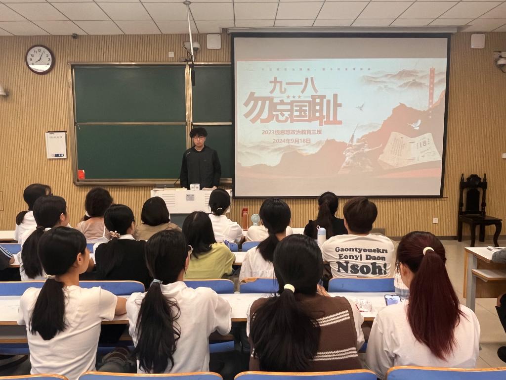 9月18日上午,太阳集团tyc59972023级思想政治教育三班在社科楼515召开“九一八,勿忘国耻”主题班会。我院2023级思想政治教育三班全体同学共同参与本次班会,班会由团支书郝瀚主持。